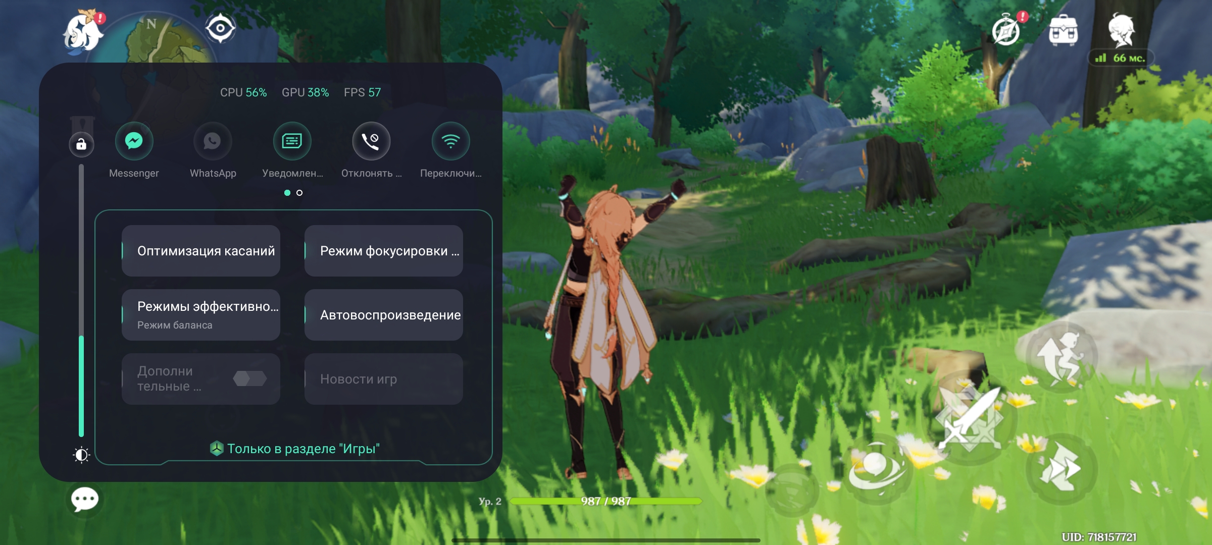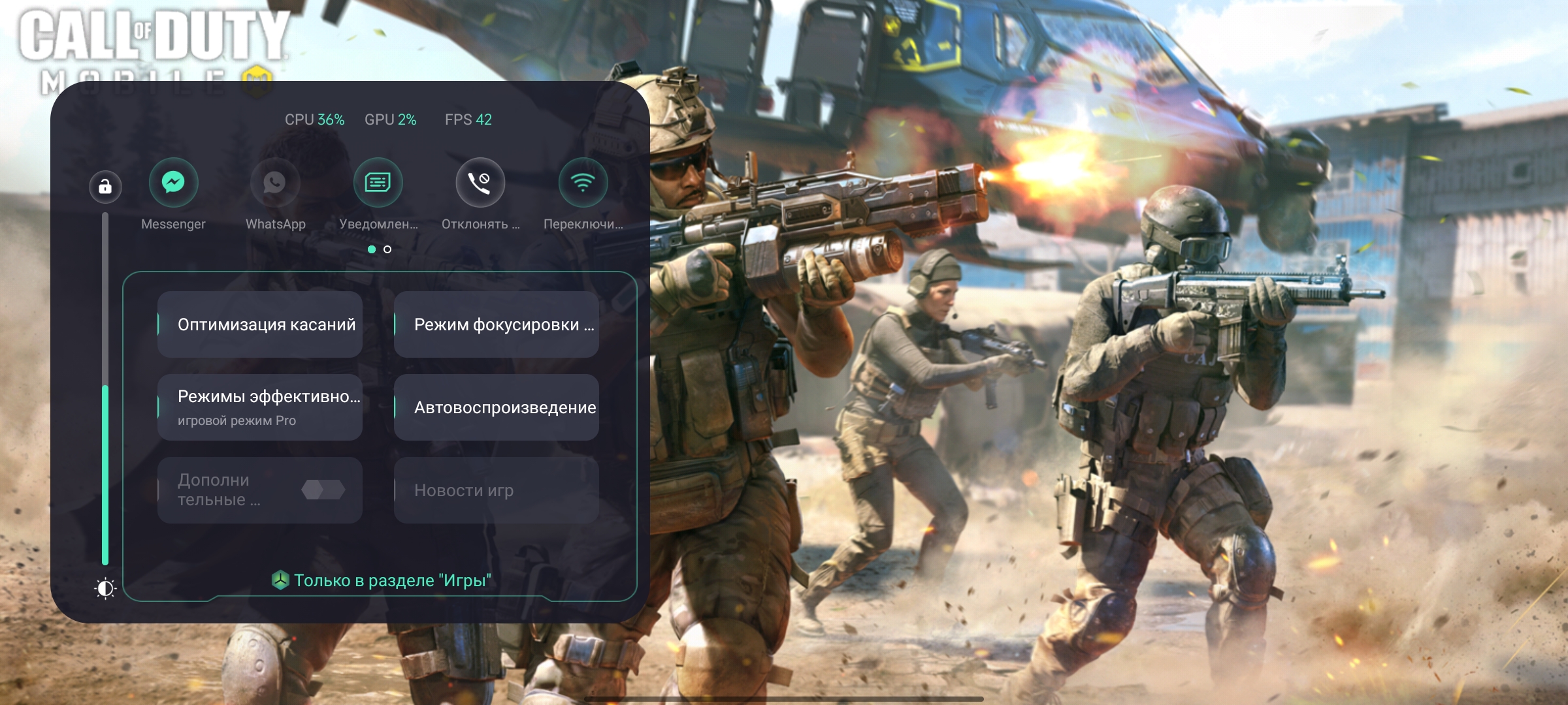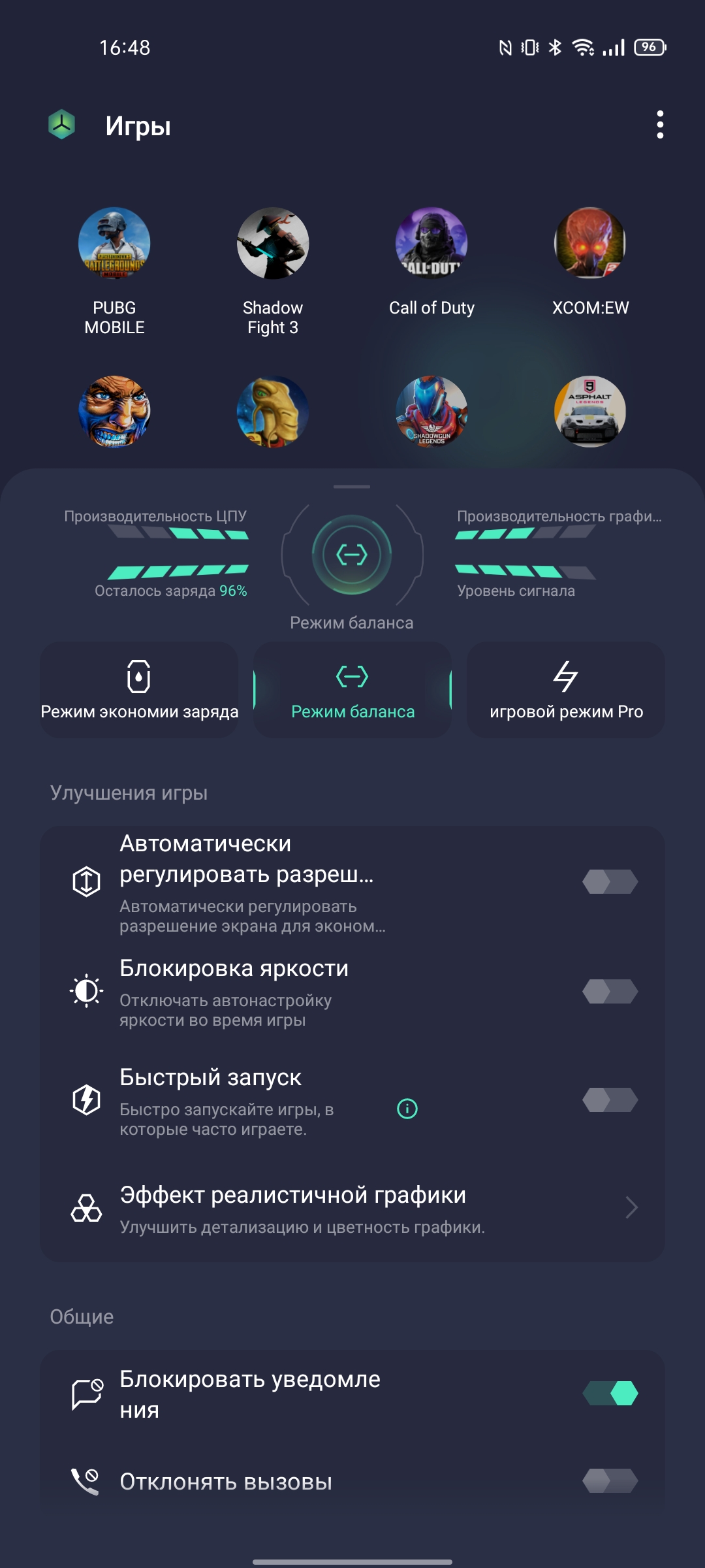 Nie ma problemów z interfejsem i działaniem ciężkich aplikacji. Gry również działają bezproblemowo. Call of Duty Mobile, Genshin Impact i Shadowgun Legends pokazują prawie stabilne 60 klatek na sekundę. Jedyną osobliwością jest Shadowgun Legends: obsługuje ekrany 120 Hz, ale z jakiegoś powodu nie zapewnia więcej niż 60 w realme GT. W zastrzeżonej aplikacji do gier możesz wybrać poziom wydajności, wyłączyć powiadomienia, dostosować czułość czujnika ekranu, zablokować poziom jasności i tak dalej.