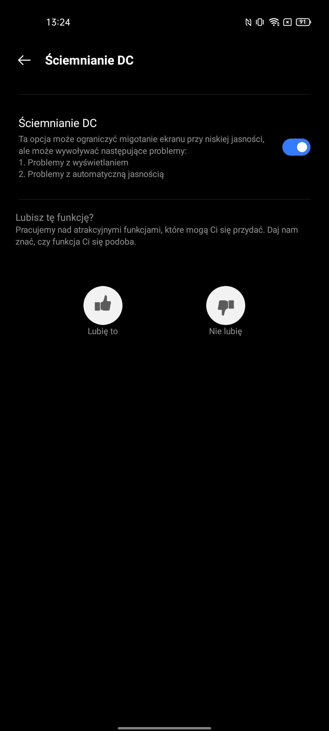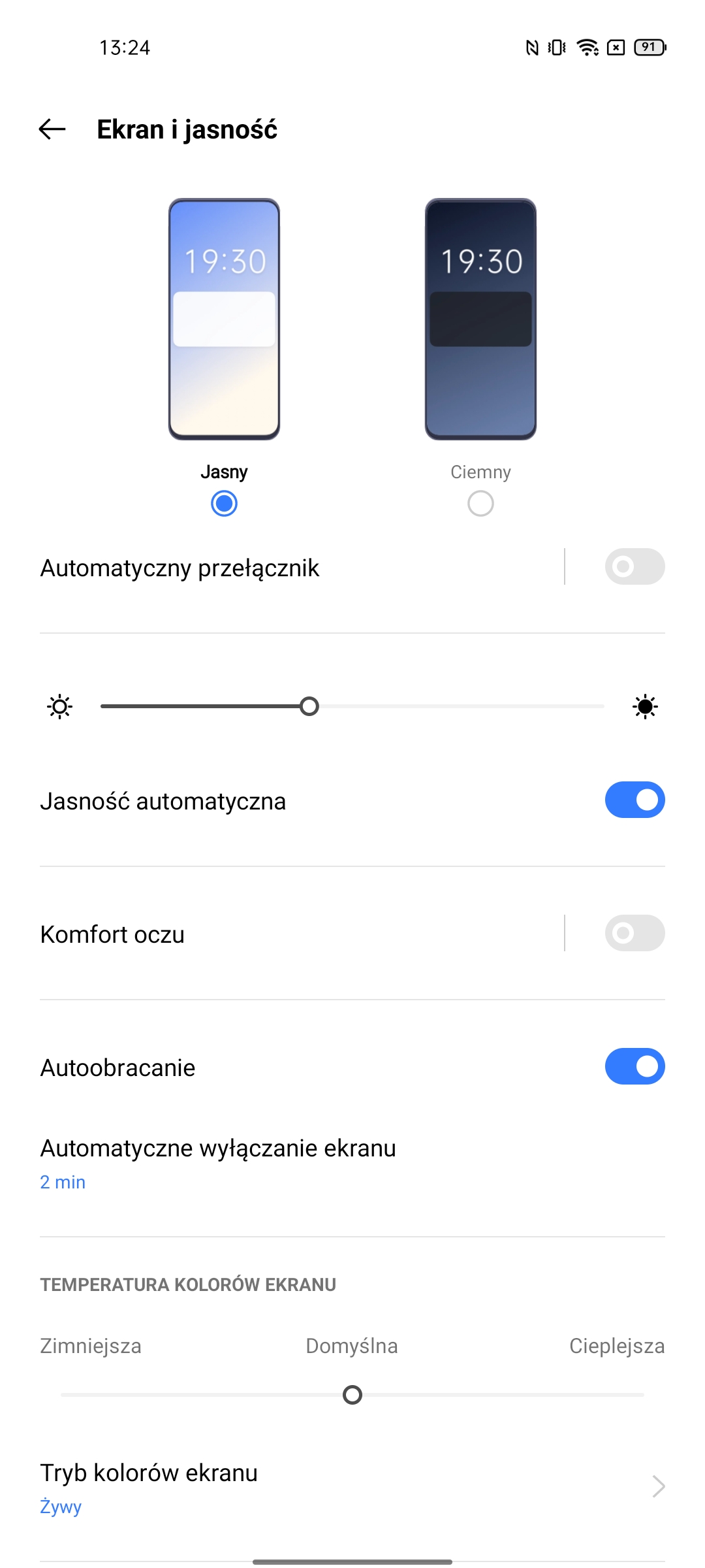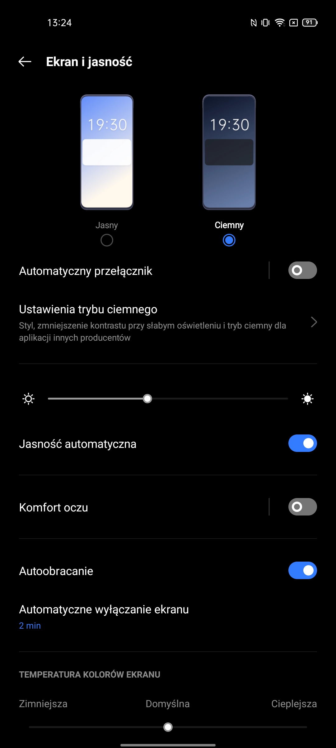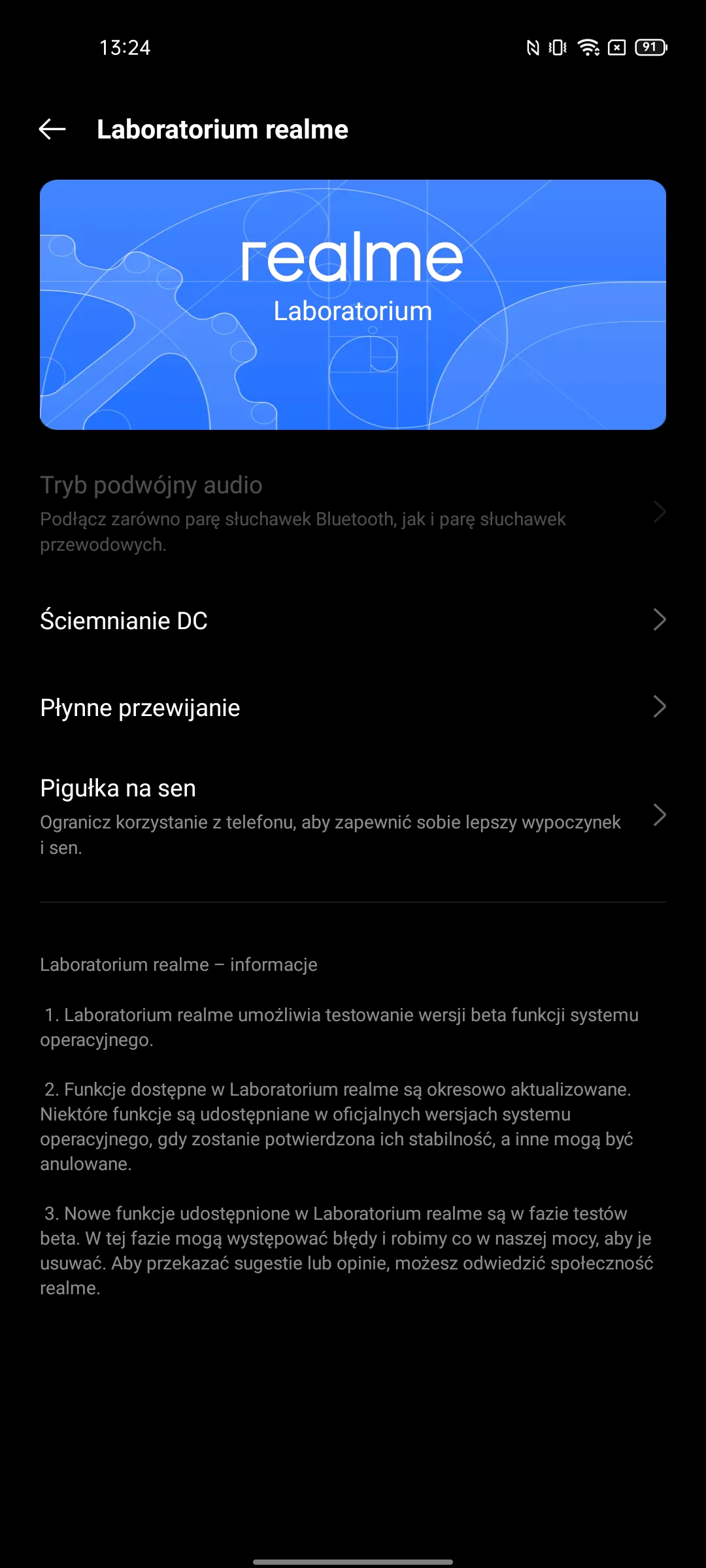 Ustawienia mają bardzo imponującą liczbę możliwości. W tym standardowe: ciemny motyw interfejsu, wybór częstotliwości odświeżania, ustawienie temperatury kolorów, Always on Display, rozmiar czcionki, różne ulepszenia treści wideo i trzy tryby renderowania kolorów.Migotanie DC Dimming jest również dostępne, ale w osobnym menu ustawień Realme Labs.