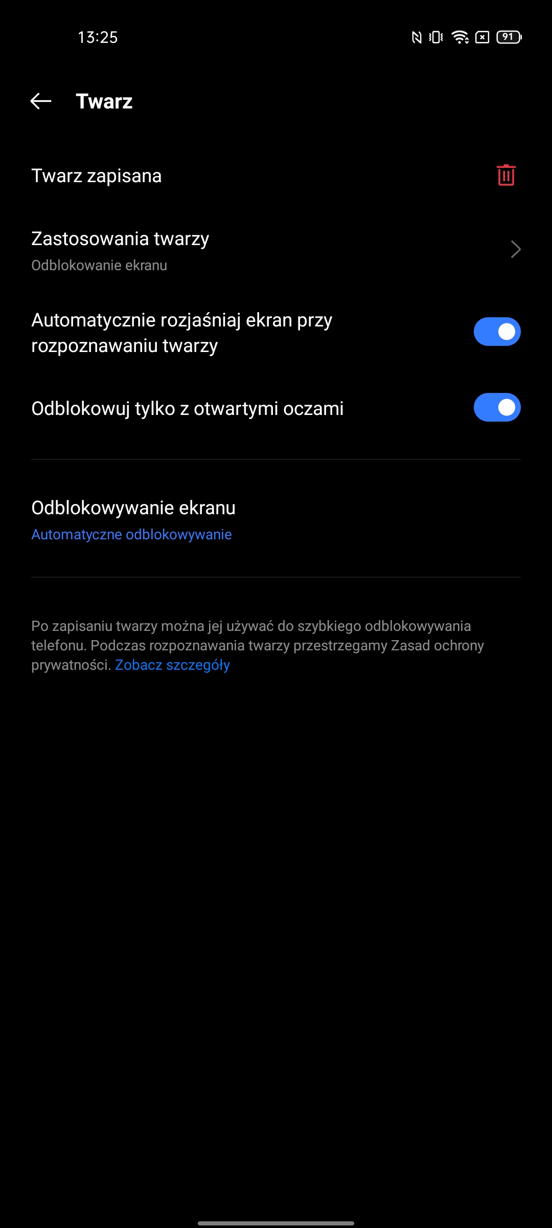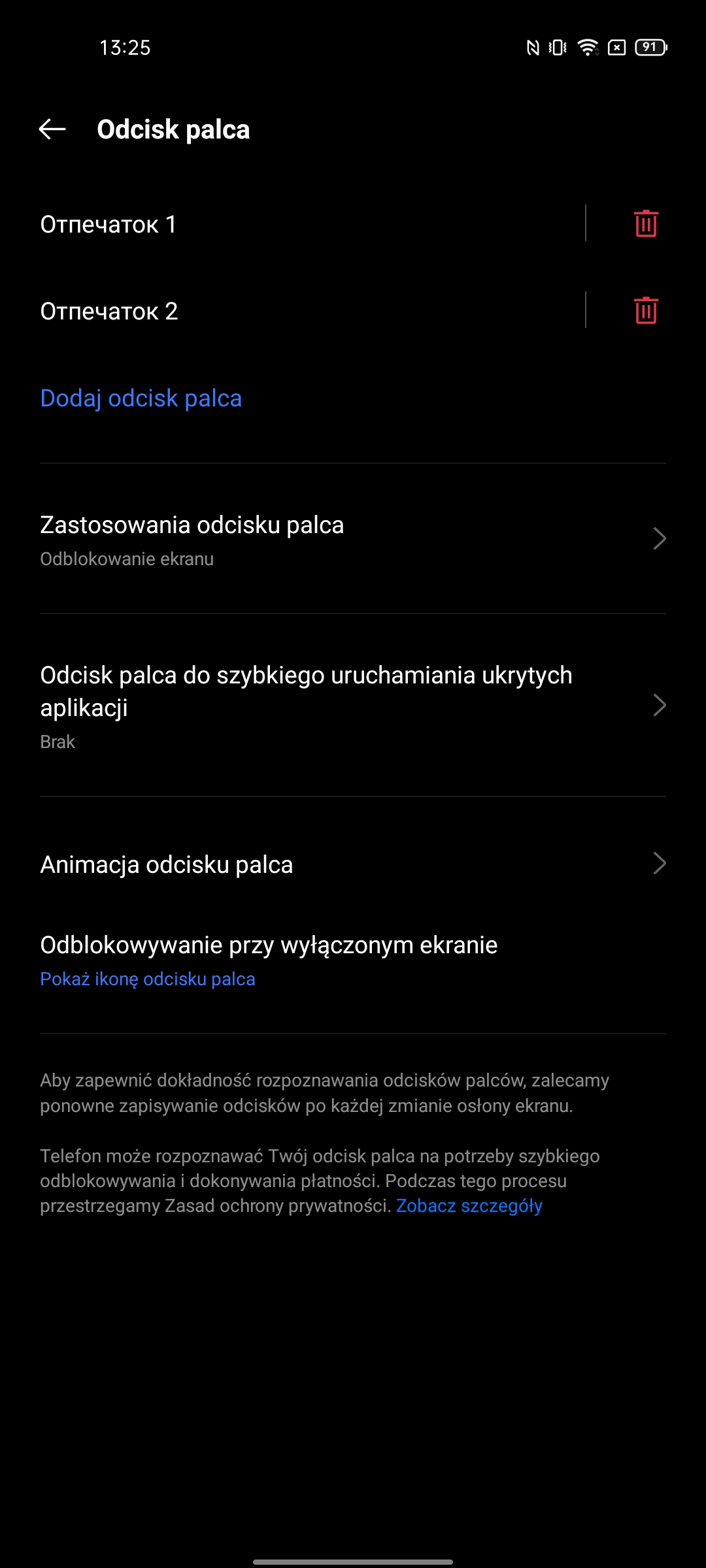 Aby ustalić kto jest właścicielem smartfona, realme GT zapewnia optyczny skaner linii papilarnych w ekranie, a także rozpoznawanie twarzy przez przedni aparat. Standardowy nowoczesny zestaw. Skaner linii papilarnych jest bardzo szybki i dokładny. Szybkość rozpoznawania jest nieco gorsza od konwencjonalnych skanerów pojemnościowych. Ale lokalizacja nie jest najwygodniejsza: skaner znajduje się bardzo blisko dolnej krawędzi smartfona i od czasu do czasu trzeba pomóc sobie drugą ręką, żeby smartfon nie wyleciał nam z ręki. Rozpoznawanie twarzy działa jak zwykle. Przy wystarczającej ilości światła nie ma problemu. W nocy – oczywiście jest trudniej i czasem nie działa. Ustawienia zapewniają możliwość automatycznego zwiększania jasności wyświetlacza w celu rozpoznawania w ciemności, a także zakaz odblokowywania twarzy przy zamkniętych oczach.