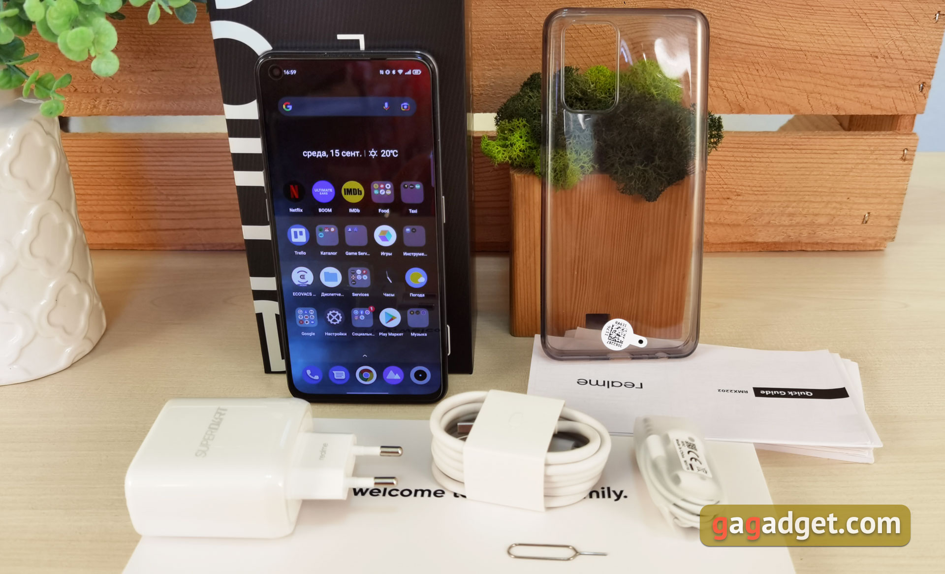 Realme GT jest zapakowany w niezbyt znane, wydłużone czarne pudełko z nazwą modelu. Zestaw zawiera sam smartfon, ładowarkę 65 W, kabel USB Type-C, proste przewodowe słuchawki, przezroczysty silikonowy etui, narzędzie do wyjmowania tacki, folię ochronną (od razu na ekranie) oraz dokumentację.