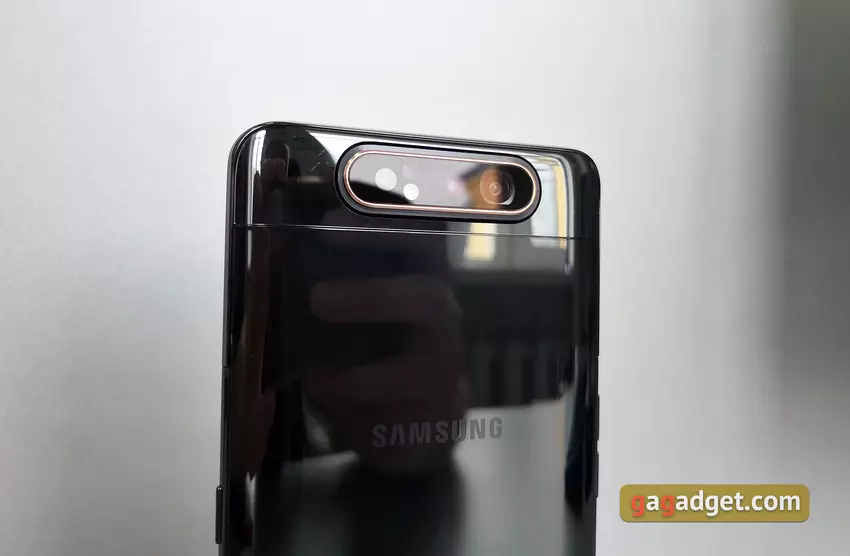 Główną cechą kamery Galaxy A80 jest jej konstrukcja. We wszystkim innym wszystko jest bardziej powszechnie na poziomie innych smartfonów średniej klasy. Główna kamera ma 48 megapikseli z aperturą f / 2.0 i bez stabilizacji optycznej, a druga dodatkowa kamera szerokątna na 8 megapikseli z kątem widzenia 123 ° i przysłoną f / 2.2. Trzeci moduł to czas lotu (ToF) z przysłoną f / 1.2 w celu określenia odległości od obiektów. Aplikacja aparatu bez żadnych niepewności. Tryby są przełączane przez przeciągnięcia. Na ekranie głównym znajduje się przełącznik kamery i wszystkie podstawowe niezbędne ustawienia. Co ciekawe, niektóre funkcje nie działały w trybie selfie (do stałej ostrości) i innych niuansach. Dziwne, biorąc pod uwagę, że używany jest ta sama kamera. Ale dzięki najnowszej aktualizacji oprogramowania wszystkie te ograniczenia zostały usunięte: