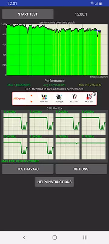 Test dławienia wykazał, że procesor działa dość stabilnie, wydajność spada do 87% tylko bliżej końca 15-minutowej pracy. Obudowa nie nagrzewa się: