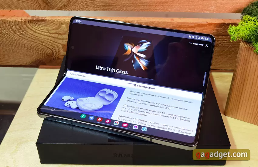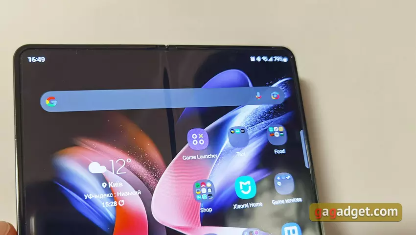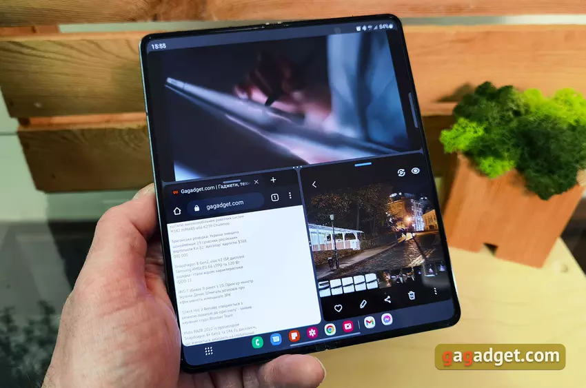 W pozycji półleżącej Samsung Galaxy Fold4 jest wygodny do korzystania z wideorozmów i pracy z dwoma aplikacjami jednocześnie. Osobno warto wspomnieć o panelu trybu gięcia. Można ją włączyć dla każdej aplikacji. Chodzi o to, że w tym trybie aplikacja jest wyświetlana u góry ekranu, a na dole - panel z kontrolkami.