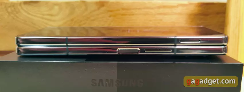 Ramka i maskownica smartfona wykonane są ze wzmocnionego, błyszczącego aluminium. Po złożeniu jest jeszcze szczelina w pobliżu zawiasu. Trudno powiedzieć, czy stała się ona mniejsza. Wszystkie elementy funkcjonalne pozostały w tych samych miejscach co w Fold3. Na dole znajduje się głośnik, złącze Type-C, mikrofon oraz plastikowe wstawki do stabilnej pracy anten.