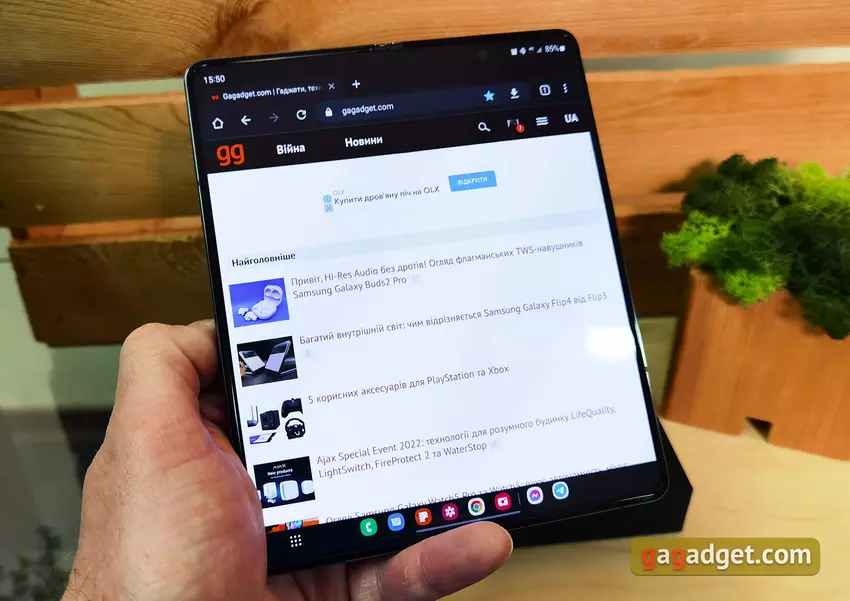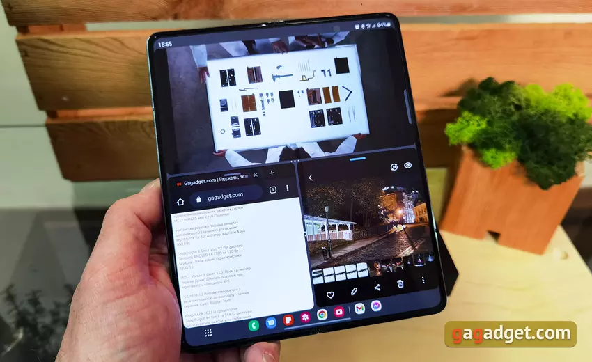 Linia Fold została opracowana z myślą o tym, aby była jak najbardziej zróżnicowana pod względem scenariuszy użytkowania. Zewnętrzny ekran wystarczy do wszystkich podstawowych funkcji (połączenia, wiadomości, komunikatory, aparat). Samsung Galaxy Fold4 w stanie złożonym jest łatwy i wygodny do manipulowania jedną ręką nawet w podróży. W stanie rozłożonym okazuje się faktycznie 7,6-calowym tabletem. Rzeczywiście, 7-calowe tablety były kiedyś normą. W tym formacie wygodnie jest surfować po sieci, pracować z dokumentami, pocztą. Osobno warto dodać o wygodnym multitaskingu. Możesz jednocześnie korzystać z trzech aplikacji, które można dowolnie przeciągać, sortować i zmieniać ich rozmiar. Takie presety można zapisać na pasku bocznym w celu szybkiego uruchomienia. W tym trybie na dole pojawia się panel jak w Windows 11 czy Mac OS z najczęściej używanymi aplikacjami do szybkiego uruchomienia. Można go ukryć lub wrócić na ekran długim dotknięciem.