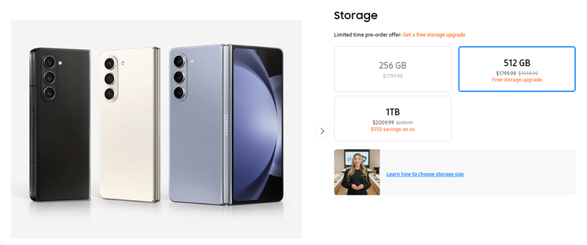 Samsung Galaxy Fold 5 jest dostępny w wariantach 256 GB, 512 GB i 1 TB wbudowanej pamięci masowej w cenie odpowiednio 1800 USD, 1920 USD i 2160 USD. Dwie wyższe wersje są teraz dostępne ze zniżką w USA. Dostawy rozpoczną się 11 sierpnia 2023 roku.
