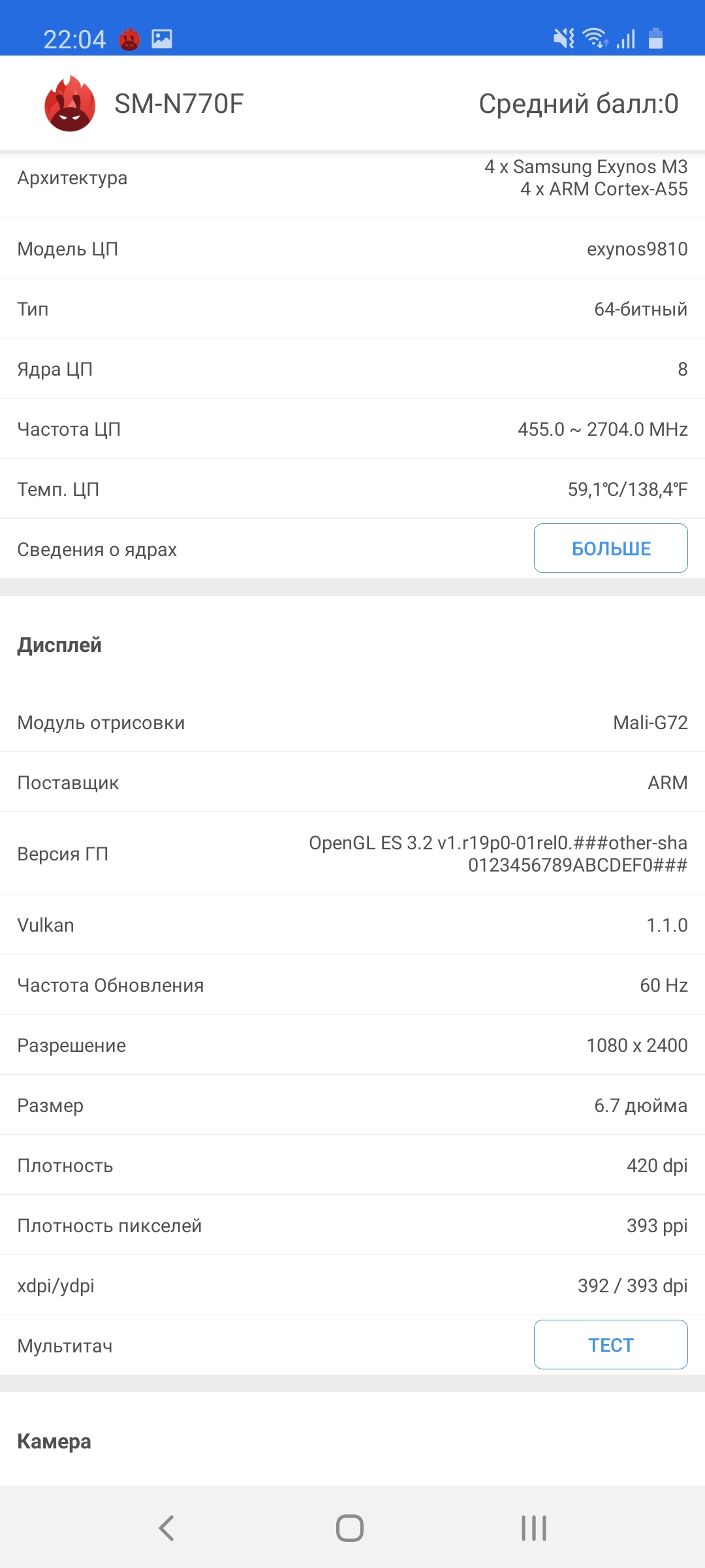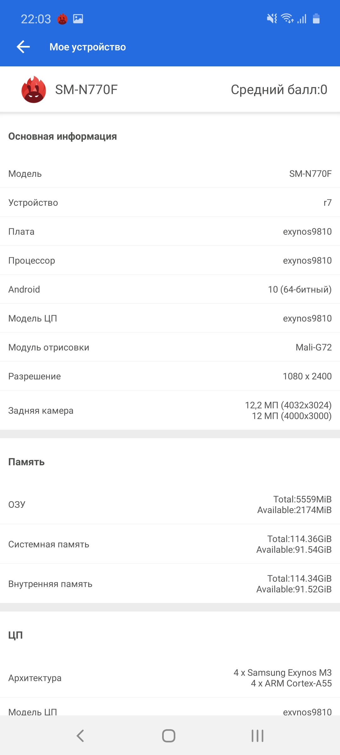 Ogólnie rzecz biorąc, smartfon otrzymał flagowe elementy poprzedniej generacji: procesor jest taki sam, jak używany w Samsungach Galaxy S9 / S9 + i Note9. Jest to bardzo dobre, ponieważ flagowe procesory zwykle nie stają się „dynią” po roku, a ich wydajność jest wciąż wystarczająca. Bardziej szczegółowo: smartfon ma 10-nanometrowy procesor Samsung Exynos 9810 z czterema wydajnymi rdzeniami 2,7 GHz Mongoose M3, czterema energooszczędnymi 1,8 GHz Cortex-A55 i akceleratorem graficznym Mali-G72 MP18. RAM - 6 GB. Tak, w testach wydajności smartfon jest nieco gorszy od obecnych flagowców, ale w codziennych zadaniach nie ma skarg na wydajność: