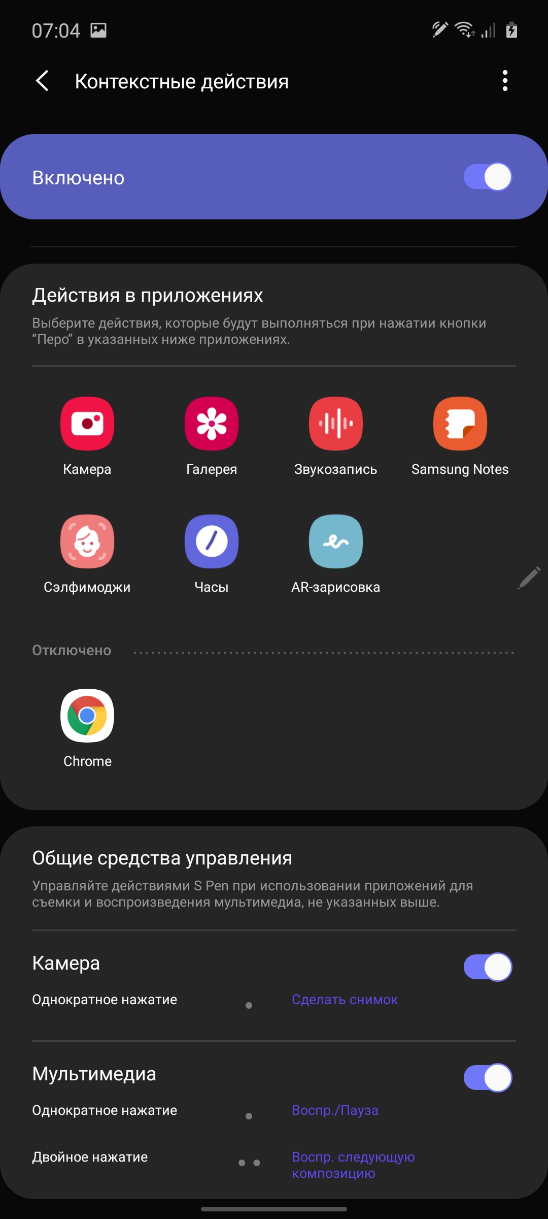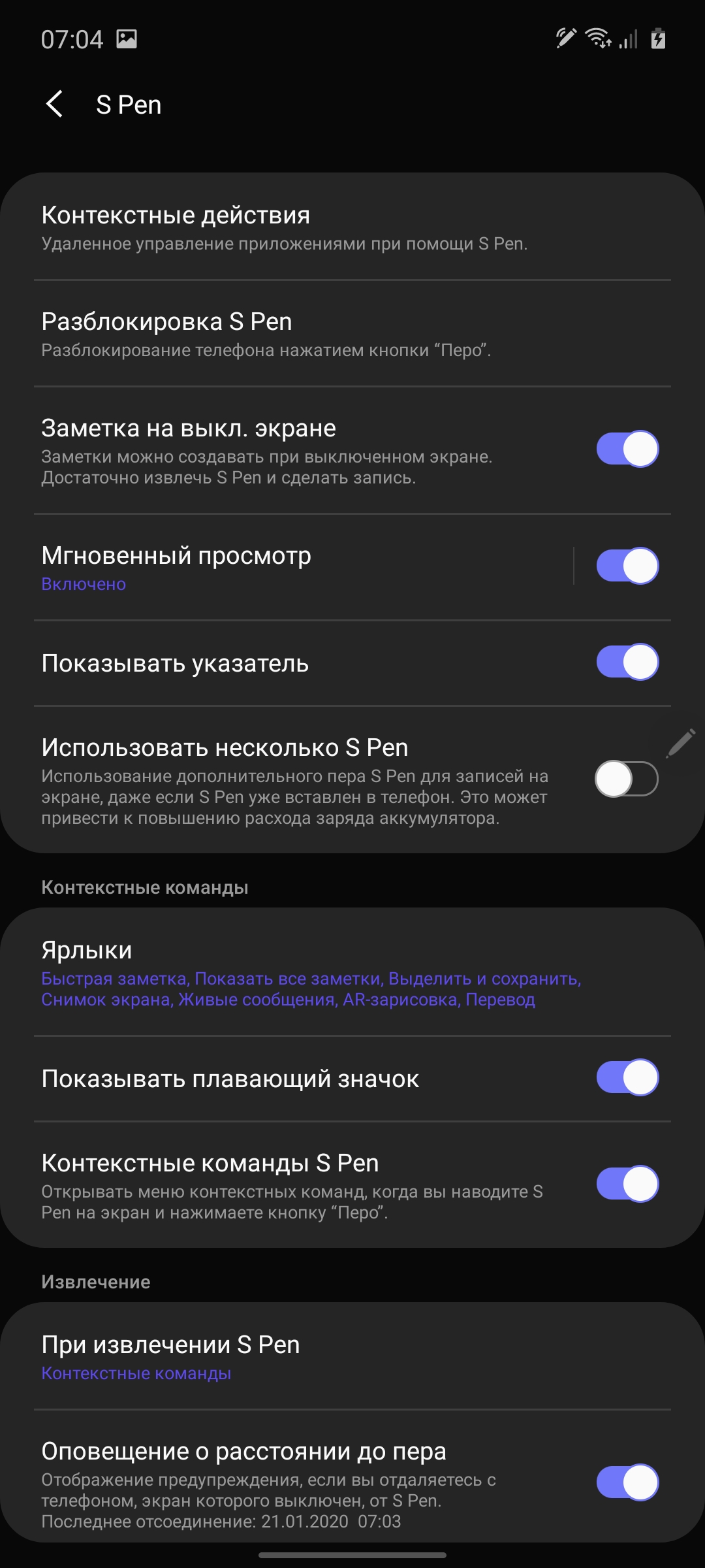 Rysik S Pen wydaje się migrować od Galaxy Note9. Może rozpoznać 4096 stopni nacisku, wyznaczyć nachylenie i jest wyposażony w jeden fizyczny przycisk. Istnieje mnóstwo różnych narzędzi do rysowania i szybkich notatek odręcznych. Istnieje możliwość wykonania zrzutu ekranu części ekranu z zapisywaniem i adnotacjami, wiadomościami GIF na żywo oraz tłumaczem. S Pen jest wyposażony w Bluetooth i wbudowaną baterię. Nie ma żyroskopu, ponieważ w Galaxy Note10 / 10 + dodatkowe gesty z rysikiem w powietrzu nie są obsługiwane, ale jako pilot zdalnego sterowania rysik może być używany z przyciskiem. Możesz przełączać utwory w odtwarzaczu, przewijać slajdy w prezentacjach, robić zdjęcia i tak dalej.