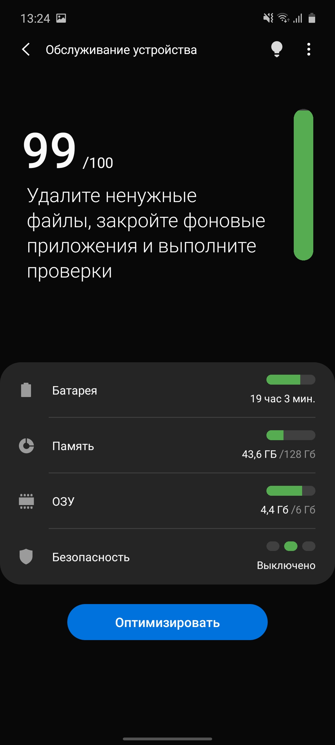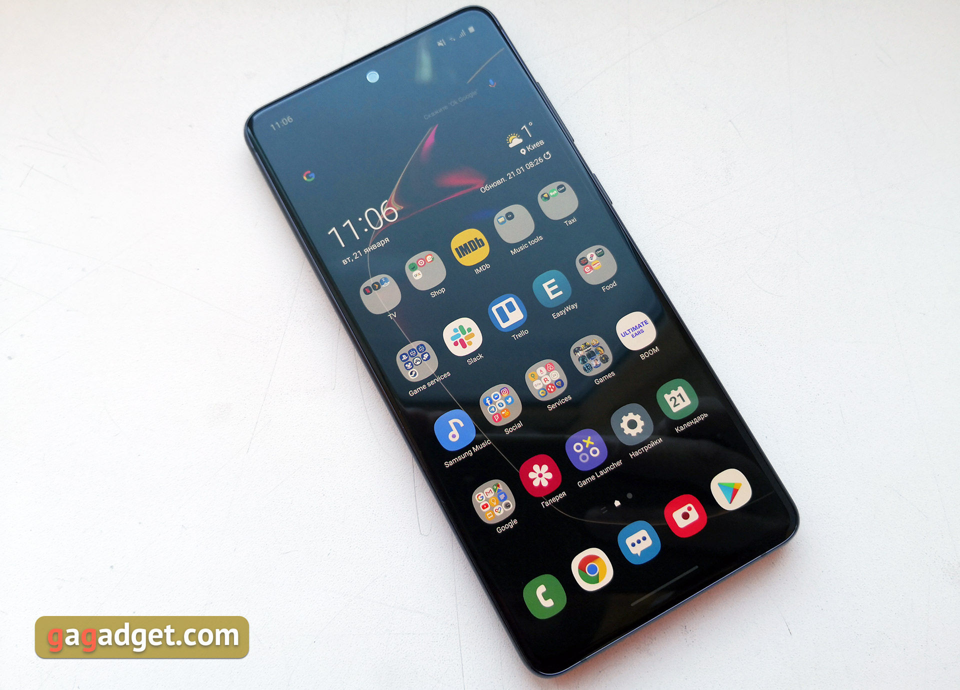 Nie ma wiele wstępnie zainstalowanych programów. Oprócz wspomnianego odtwarzacza, radia i innych niezbędnych aplikacji, istnieje narzędzie do optymalizacji smartfona (czyszczenie pamięci RAM, pamięci, diagnostyka), tradycyjny asystent Bixby, menedżer plików, notatki i S Health. Co ciekawe, S Health nie wydaje się być jeszcze zaktualizowany: interfejs pozostaje jasny w trybie ciemnego motywu interfejsu.
