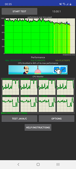 Smartfon działa dość stabilnie podczas długich szczytowych obciążeń, zauważalne obniżenie wydajności obserwuje się dopiero po 10 minutach testu dławienia, przy tym spada do 86%, co nie jest krytyczne.