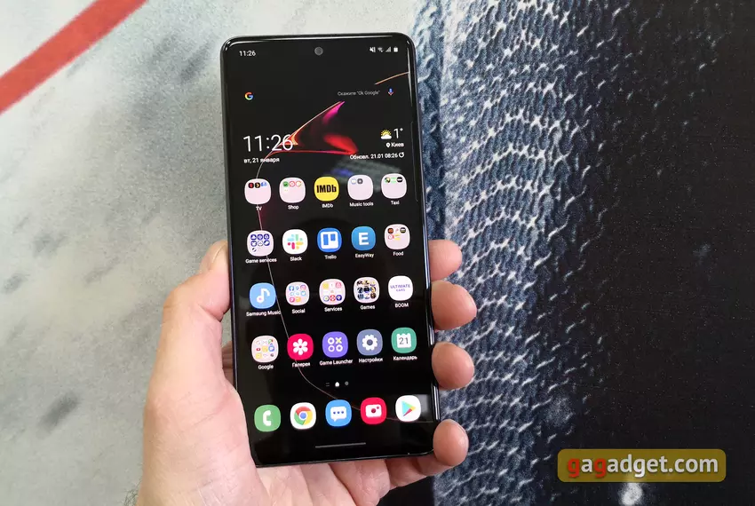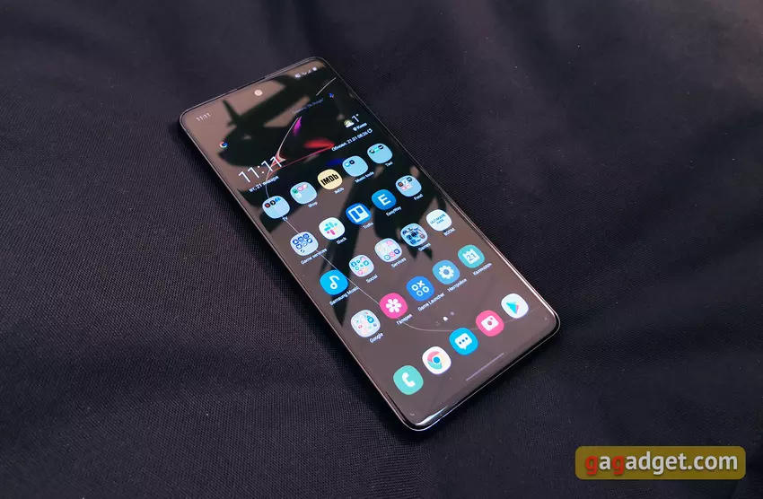 Galaxy Note10 Lite jest wyposażony w wyświetlacz Super AMOLED o przekątnej 6,7 cala i rozdzielczości 2400 × 1080. Nieco mniejszy niż Galaxy Note10 + (6,8 cala) i większy niż Galaxy Note10 (6,3 cala), ale proporcje nowości są bardziej wydłużone: 20: 9 zamiast 19: 9. Gęstość pikseli wynosi 394 ppi, czyli nieco mniej niż w Note10 przy 401 ppi. W ustawieniach znajduje się standardowy zestaw: regulacja jasności, wybór rozmiaru czcionki, skala elementów interfejsu, niebieski filtr, ciemny motyw interfejsu, Always on Display, oświetlenie krawędzi (po otrzymaniu powiadomień) oraz dwa tryby wyświetlania kolorów: „naturalny” i „nasycony”. Ten ostatni ma możliwość regulacji temperatury barwowej. To wszystko, co widzieliśmy w poprzednich modelach Samsunga. Co ciekawsze, dostępna jest teraz ochrona przeciw migotaniu (ściemnianie DC w niektórych smartfonach). Wygląda na to, że pojawiła się z nową wersją oprogramowania. Ale nie ma tego w ustawieniach: działa domyślnie i nie można ją wyłączyć. Chociaż nie widzę wiele powodów, aby ją wyłączyć.