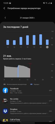 Pojemność baterii to 4500 mAh, czyli nawet nieco więcej niż flagowy Galaxy Note10 +. Średnio wystarcza aktywne użycie na półtora dnia, w tym niektóre gry i filmy z YouTube, sieci społecznościowych, poczty, surfowania po Internecie i kilka zdjęć. Bardziej aktywni gracze przetrwają jeden dzień, a bardziej powściągliwi użytkownicy będą mogli nie ładować przez 2 dni. Istnieją różne opcje na temat trybów oszczędzania energii, a także coś takiego jak standardowa funkcja Android Well Digital Wellbeing (Digital Balance), Samsung nazwał to „użytkowaniem urządzenia i kontrolą rodzicielską”. Zaprojektowany do monitorowania użytkowania smartfona, czasu w różnych aplikacjach i limitów czasowych w razie potrzeby. Ogólnie rzecz biorąc, był w poprzedniej wersji One UI, ale wraz z aktualizacją funkcji stał się większy i zmieniono wygląd.