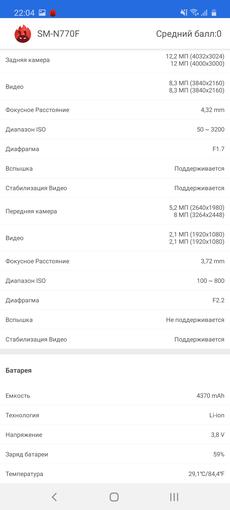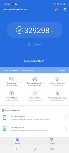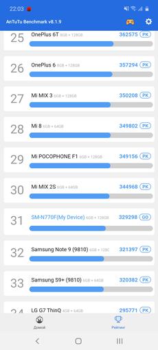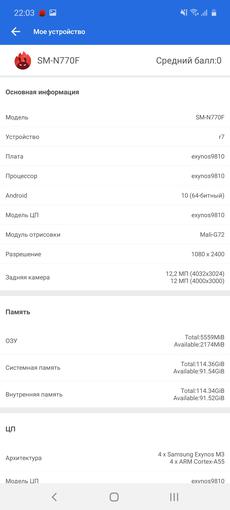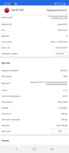 Ogólnie rzecz biorąc, smartfon otrzymał flagowe elementy poprzedniej generacji: procesor jest taki sam, jak używany w Samsungach Galaxy S9 / S9 + i Note9. Jest to bardzo dobre, ponieważ flagowe procesory zwykle nie stają się „dynią” po roku, a ich wydajność jest wciąż wystarczająca. Bardziej szczegółowo: smartfon ma 10-nanometrowy procesor Samsung Exynos 9810 z czterema wydajnymi rdzeniami 2,7 GHz Mongoose M3, czterema energooszczędnymi 1,8 GHz Cortex-A55 i akceleratorem graficznym Mali-G72 MP18. RAM - 6 GB. Tak, w testach wydajności smartfon jest nieco gorszy od obecnych flagowców, ale w codziennych zadaniach nie ma skarg na wydajność: