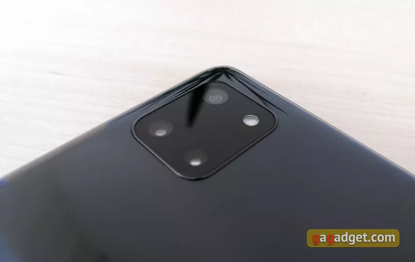 Główna potrójna kamera została umieszczona w czarnym prostokącie z zaokrąglonymi narożnikami. Konstrukcja przypomina linię Google Pixel 4 lub iPhone 11, ale w Galaxy Note10 Lite praktycznie nie wystaje i wygląda ładniej niż w powyższych modeli. We wszystkich opcjach kolorystycznych kamera jest czarna, a w przypadku czarnej obudowy prawie nie jest widoczna.