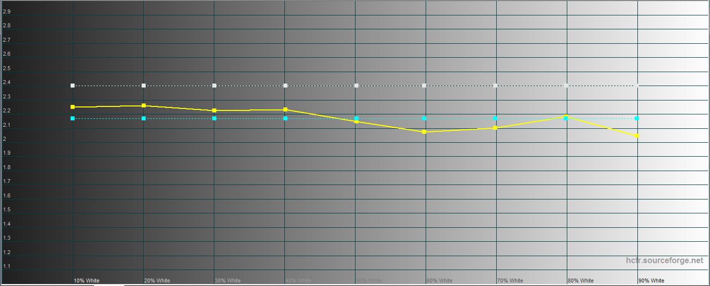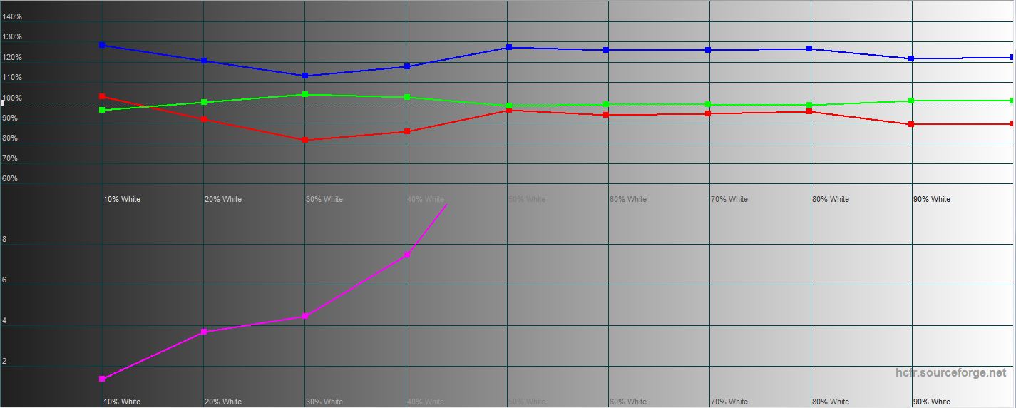 W trybie „nasyconym” maksymalna jasność ekranu jest nieco wyższa niż 398,897 cd / m2. "Wylatuje" nieco do zimnych odcieni, ale także na rozsądną miarę. Gama kolorów jest znacznie szersza niż sRGB, jak we wszystkich AMOLED: