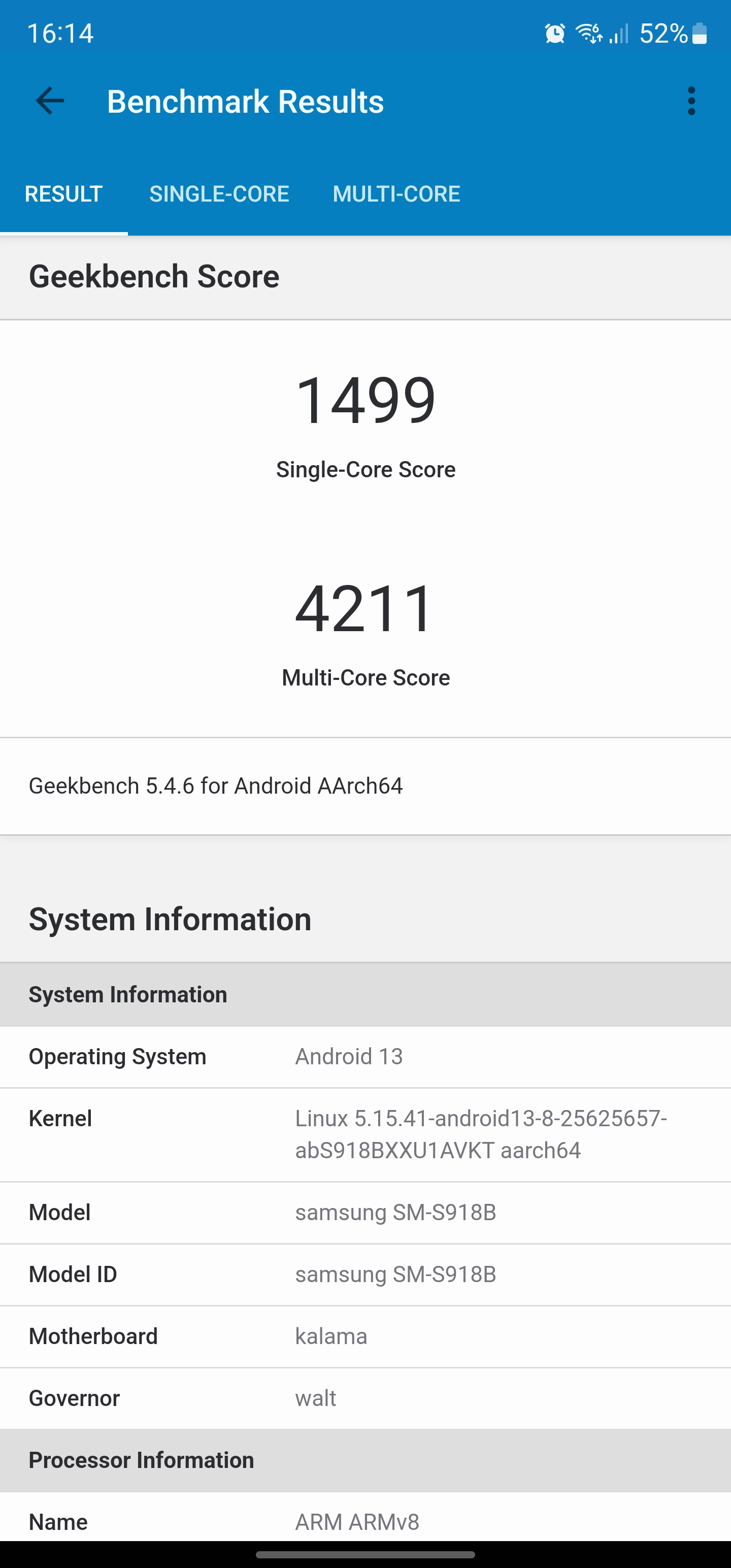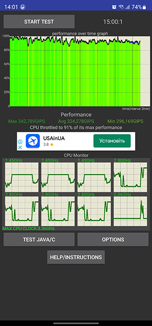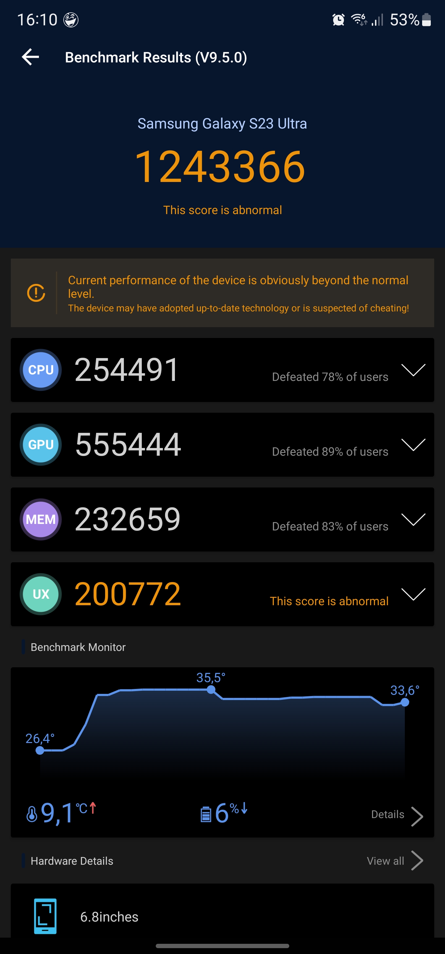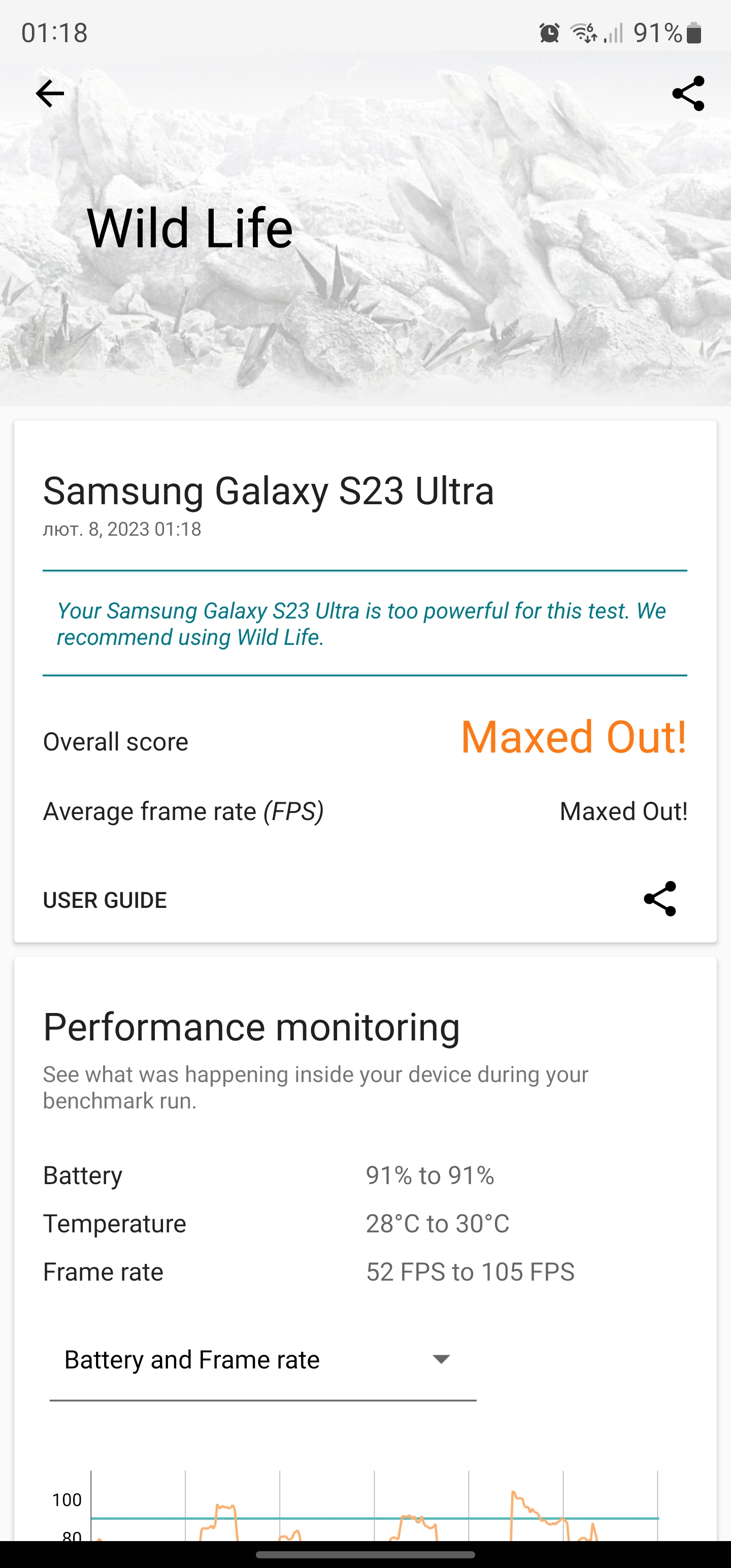 Wszyscy producenci mają niezbyt dobre procesory. W zeszłym roku Samsung Exynos 2200 miał pewne problemy: bardzo się nagrzewał i dość szybko zużywał energię z baterii. Qualcomm Snapdragon 8 Gen 2 Mobile Platform for Galaxy został lepiej zoptymalizowany. Przy maksymalnym obciążeniu w teście CPU Throttling wydajność spada do zaledwie 91% w ciągu 15 minut, co jest bardzo dobrym wynikiem jak na tak wydajny procesor. Obudowa staje się ciepła, ale nie parzy rąk.