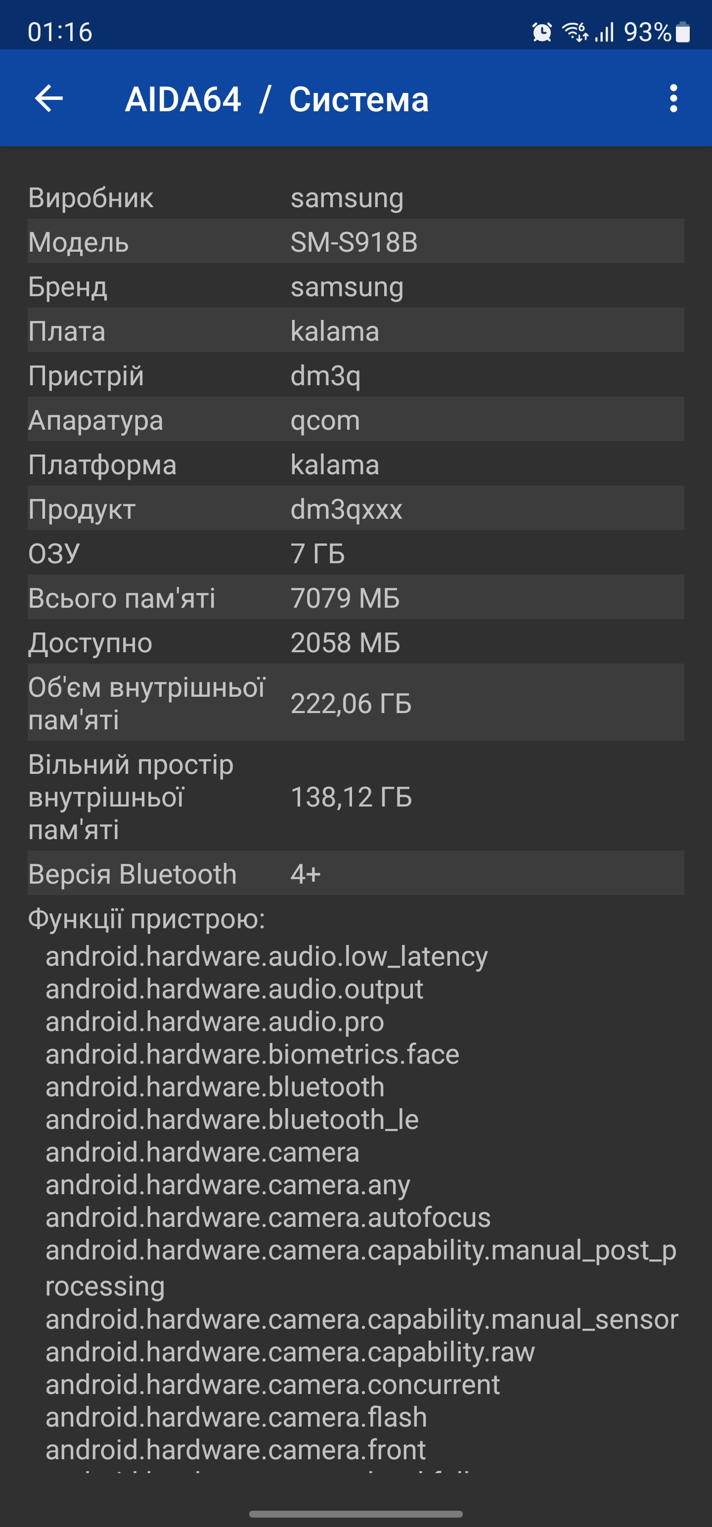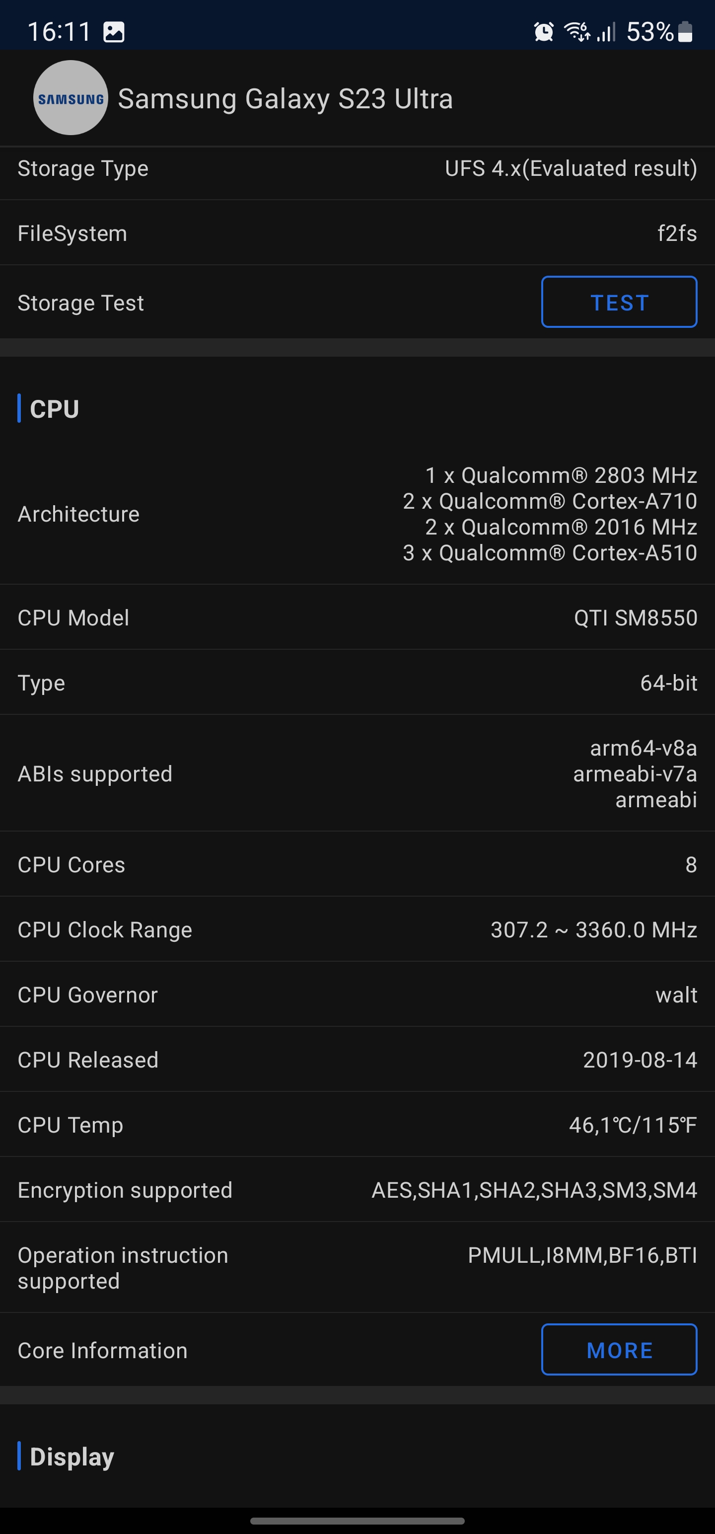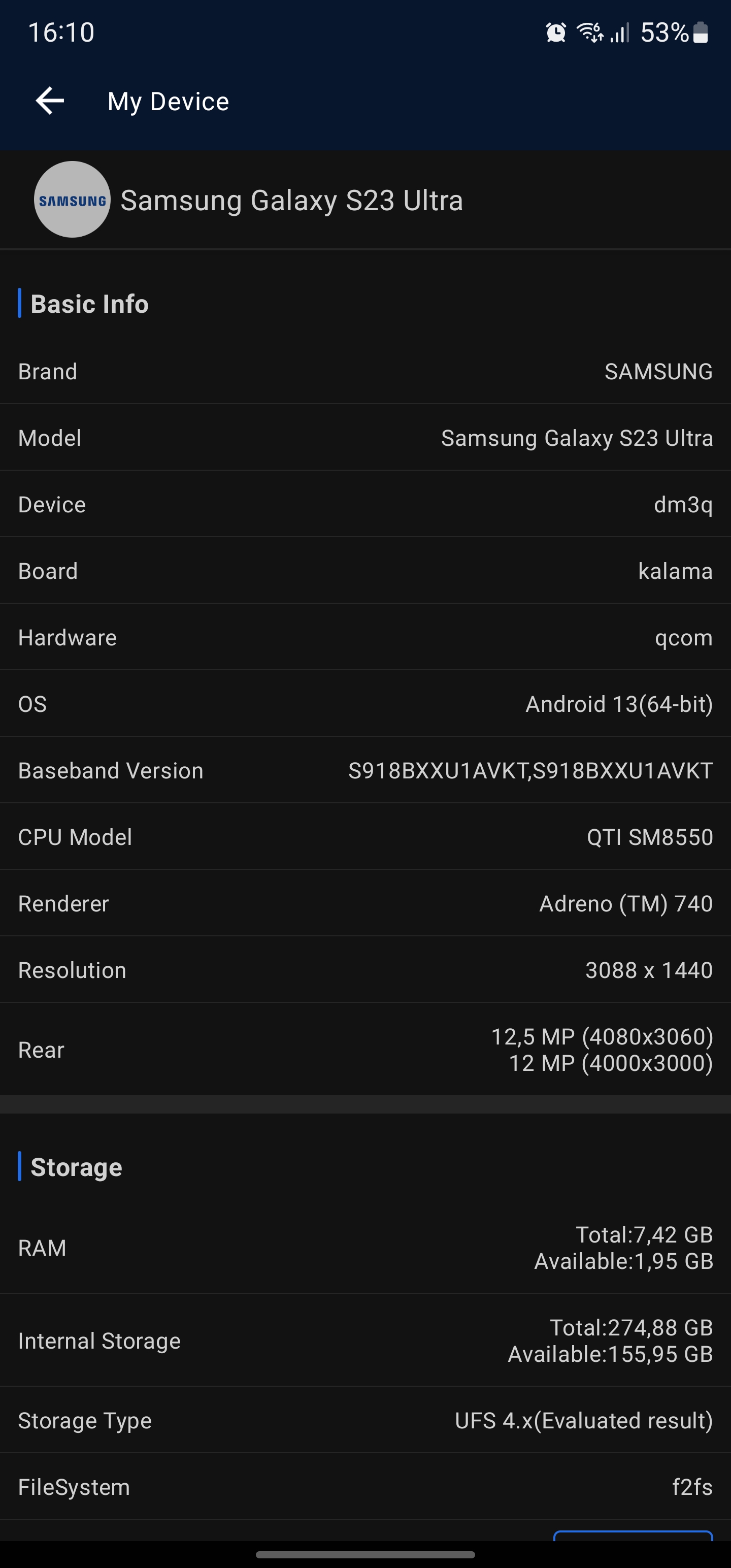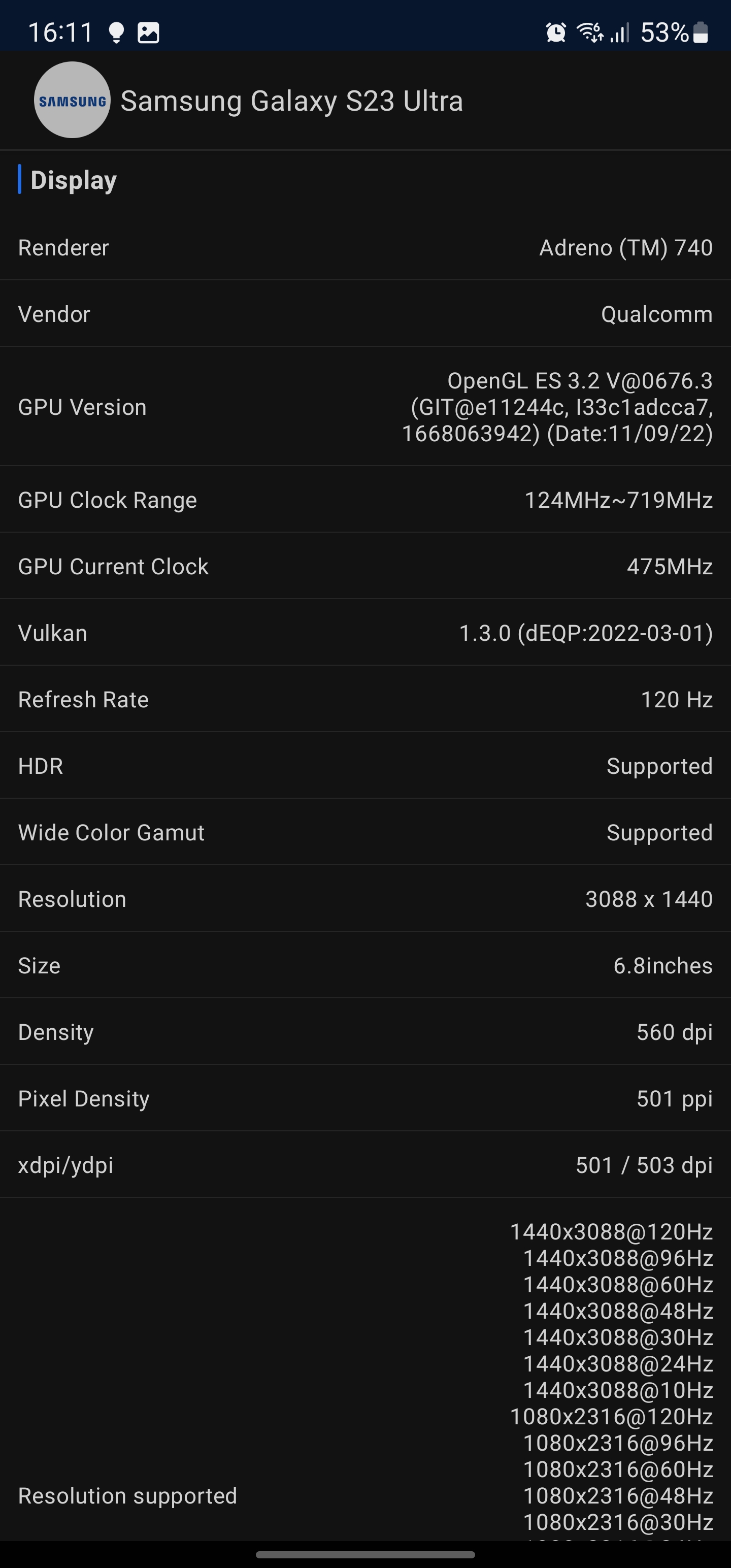 Samsung Galaxy S23 Ultra wykorzystuje 6,8-calowy wyświetlacz Dynamic AMOLED 2X o niemal płaskim kształcie. Zagięcia po bokach są minimalne. Jest on wykonany w technologii LTPO i obsługuje adaptacyjną częstotliwość odświeżania 1-120 Hz, a częstotliwość odczytu matrycy wynosi 240 Hz. Rozdzielczośćwynosi 3088x1440, a zagęszczenie pikseli to około 500 ppi. Samsung obiecuje, że szczytowa jasność wynosi 1750 cd/m2. Choć warto pamiętać, że jasność szczytowa to maksymalna możliwa jasność bardzo małego obszaru bieli przez minimalny okres czasu, więc jest to raczej oznaczenie marketingowe. Jest wsparcie dla HDR10+ i Dolby Vision. Gamut kolorów to 100% przestrzeni barw DCI-P3. Wizualnie nie można narzekać na ekran: duży margines jasności, maksymalne kąty widzenia i bardzo bogate kolory. Ogólnie rzecz biorąc, jest to jeden z najlepszych ekranów, jakie widziałem i używałem.
