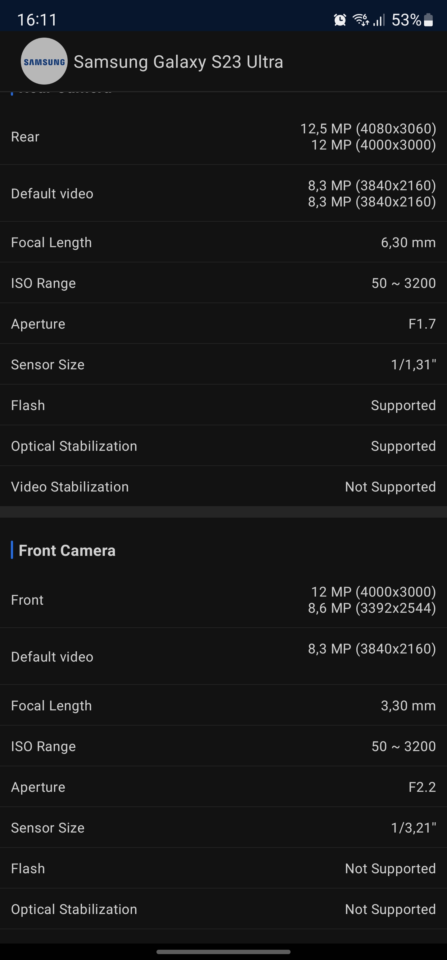 Samsung Galaxy S23 Ultra ma cztery tylne aparaty, tak jak jego poprzednik. Na wszystkie możliwe okazje i potrzeby. Główny moduł ma teraz rozdzielczość 200 megapikseli Adaptive Pixel, a w trybie standardowym łączy 16 pikseli w jeden, zdjęcia mają rozdzielczość 12 MP. Dodatkowo dostępne są tryby 50 i 20 MP. Główny moduł posiada optykę f/1.7, 23 mm ECF, rozmiar sensora 1/1.3", 0.6 µm, autofokus z detekcją fazy Dual Pixel PDAF oraz stabilizację optyczną z podwojonym kątem korekcji we wszystkich kierunkach. Ulepszono także algorytmy przetwarzania nocnej fotografii. Pierwszy 10 MP teleobiektyw to f/2.4, 70 mm, 1/3.52", 1.12µm, Dual Pixel PDAF, OIS z trzykrotnym zoomem. Drugi teleobiektyw to peryskopowy, 10 MP, f/4.9, 230 mm CCD, 1/3.52", 1.12µm, Dual Pixel PDAF, OIS, 10-krotny zoom. Oraz ultraszerokokątny aparat z 12 MP, f/2.2, 13 mm, kąt widzenia 120°, 1/2.55", 1.4µm, również Dual Pixel PDAF. Aparat zmienił się nieco od czasu. Teraz ma 12-megapikselowy aparat z przysłoną f/2.2, 25 mm EFE i autofokusem z detekcją fazy. Maksymalna rozdzielczość wideo pozostaje 8K, ale teraz jest to 30 FPS zamiast 24 w poprzedniej generacji.