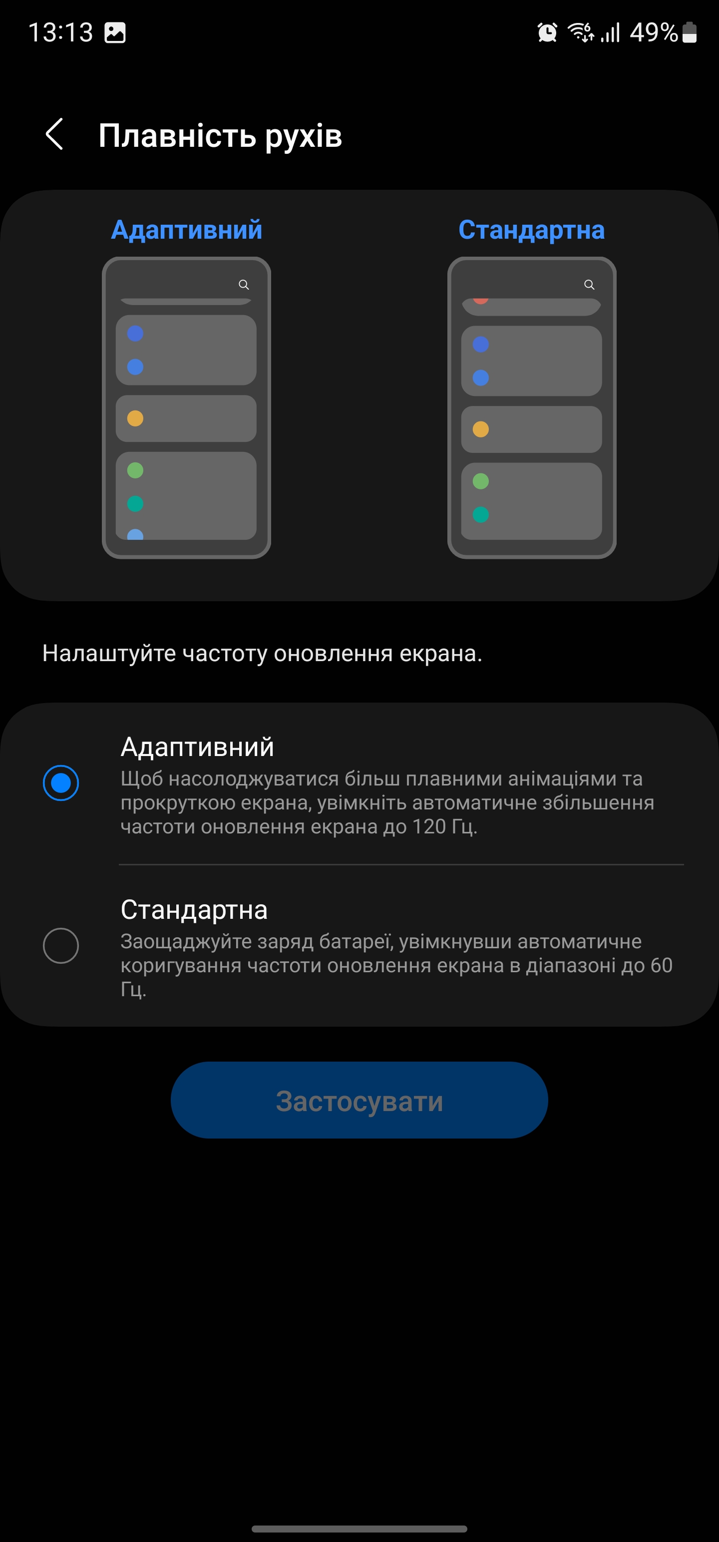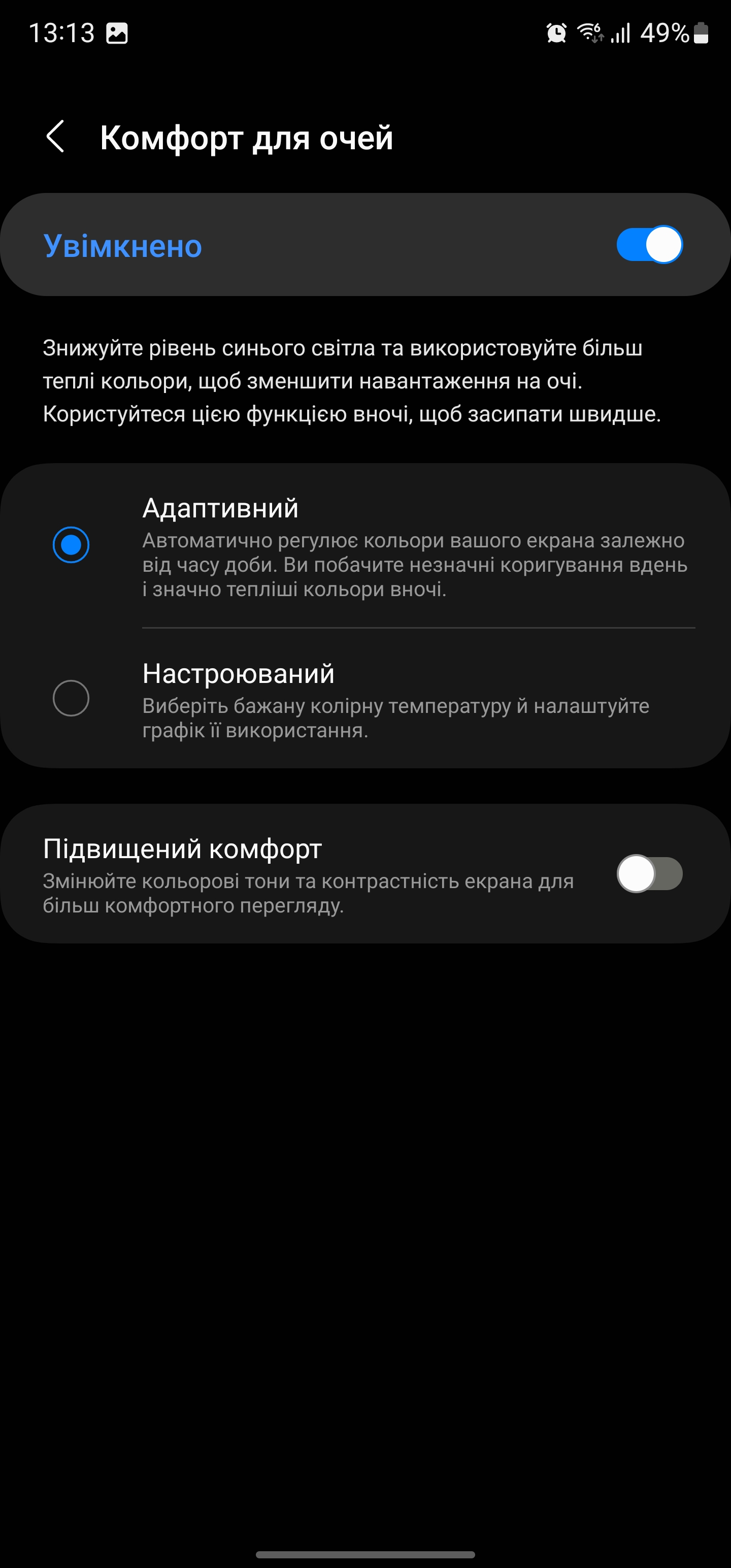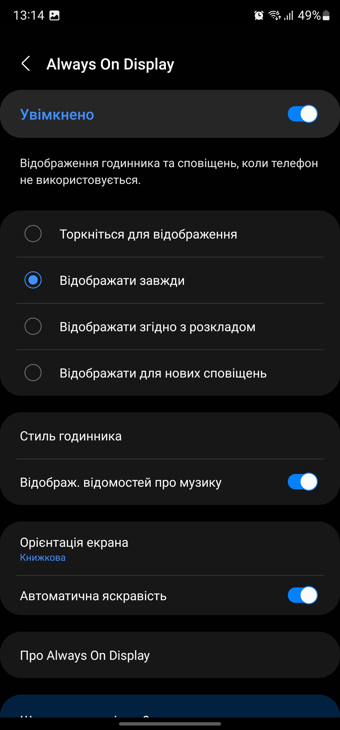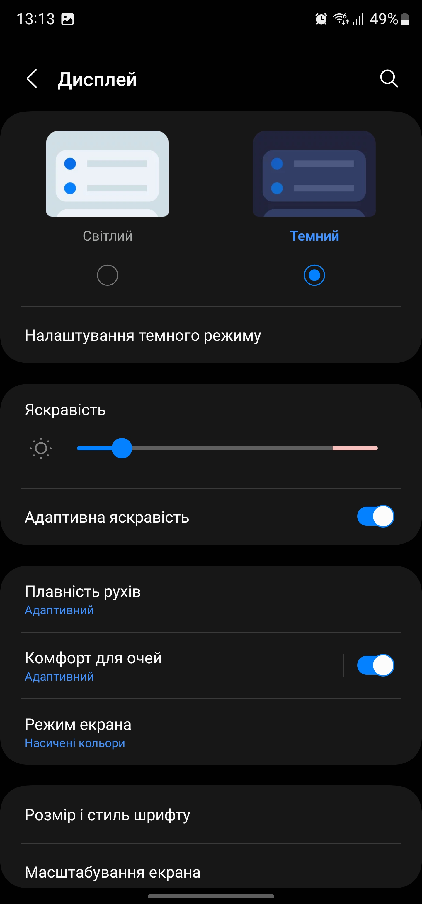 W ustawieniach możemy wybrać ciemny i jasny motyw (lub aktywować automatyczne przełączanie), dostosować jasność (jest tryb wysokiej jasności), wybrać częstotliwość odświeżania ekranu (adaptacyjna 1-120 Hz i standardowa 60 Hz), włączyć komfort dla oczu (automatyczne dostosowanie temperatury barwowej w zależności od oświetlenia otoczenia), tryb wyświetlania kolorów (nasycony lub naturalny sRGB), dostosować skalę i czcionkę interfejsu oraz Always on Display. Wszystko znane z flagowców Samsunga z ostatnich lat.