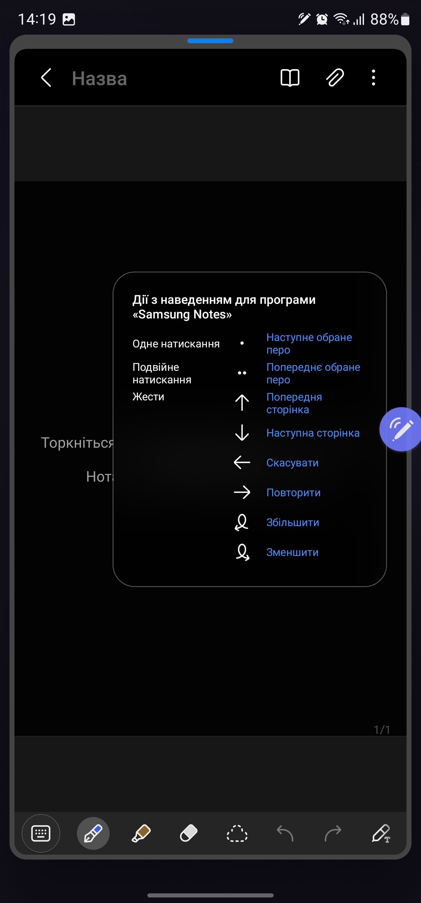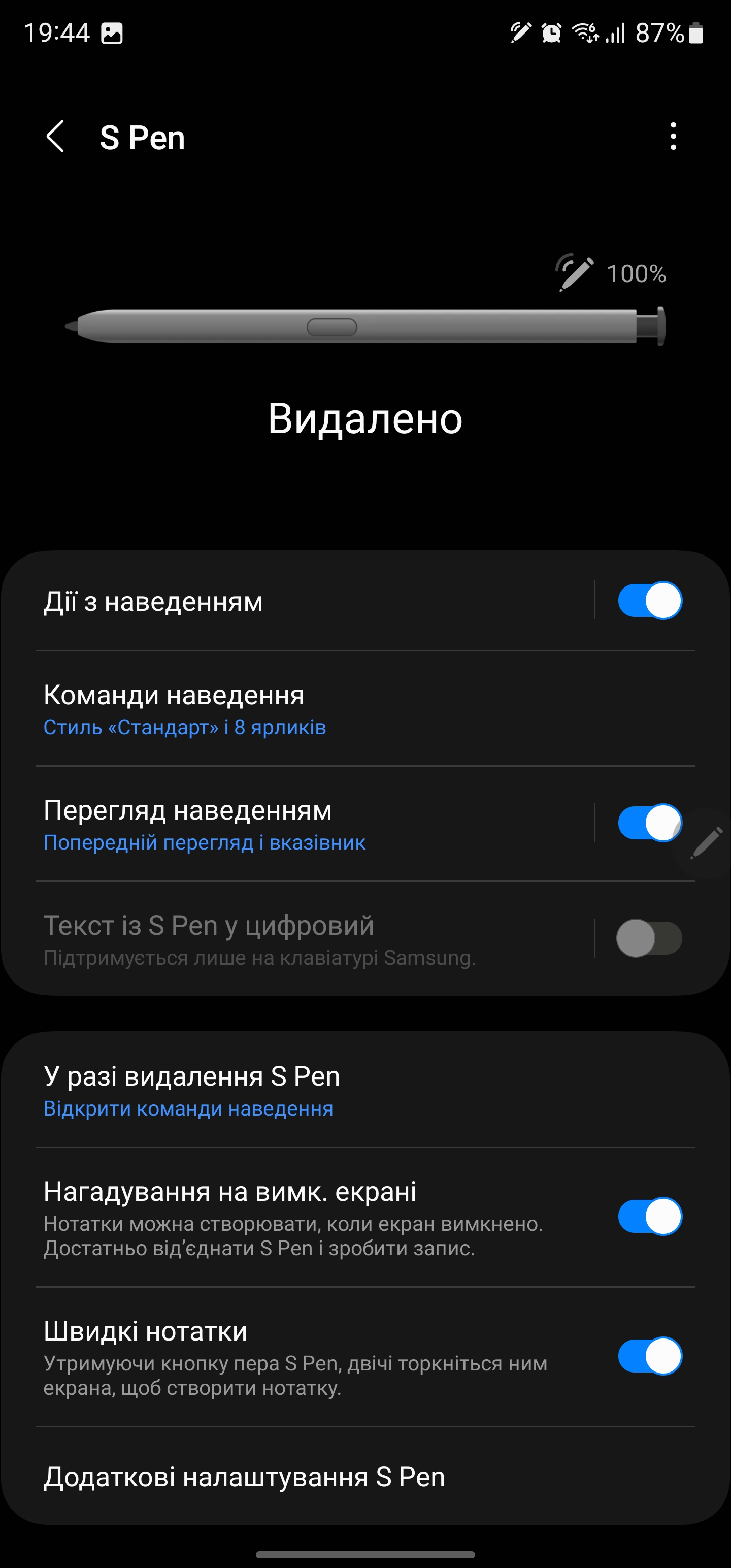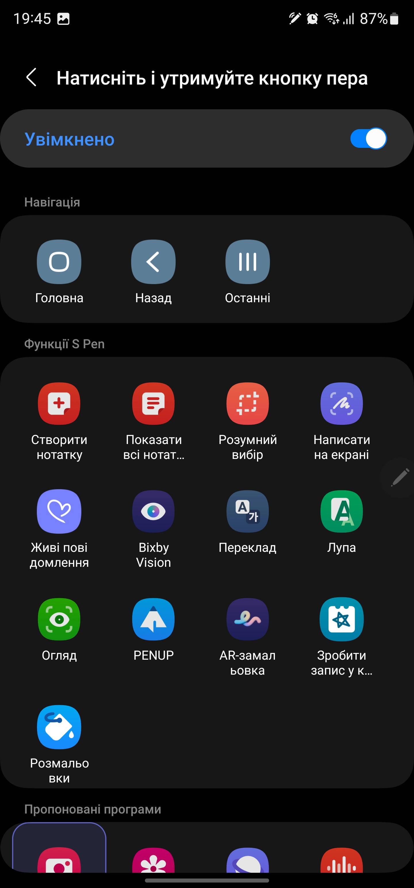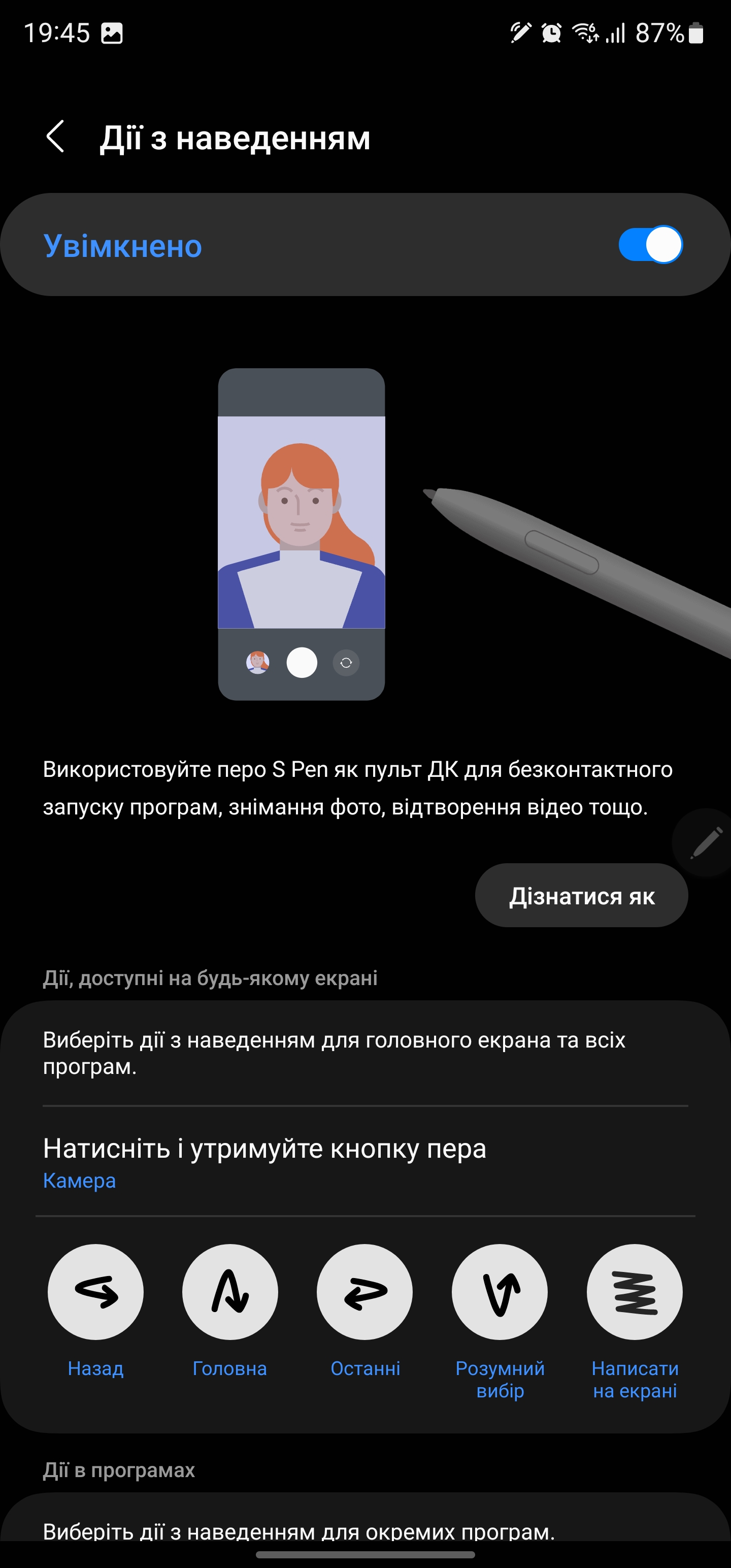 S Pen może być używany jako pilot. W różnych aplikacjach można ustawić różne gesty z rysikiem w powietrzu: przełączanie utworów, pauza, odtwarzanie w odtwarzaczu, zoom, przełączanie kamer i trybów w aparacie itp.