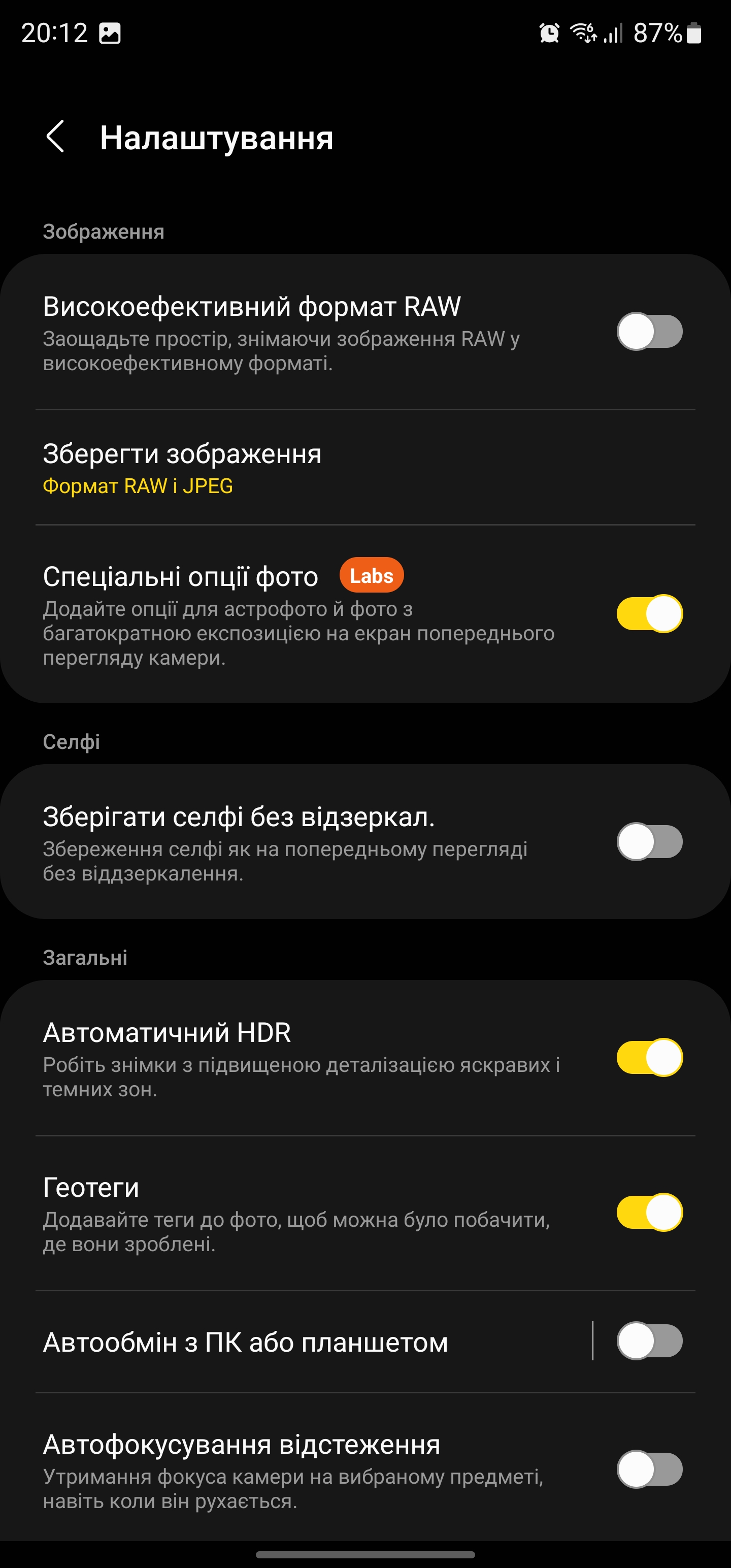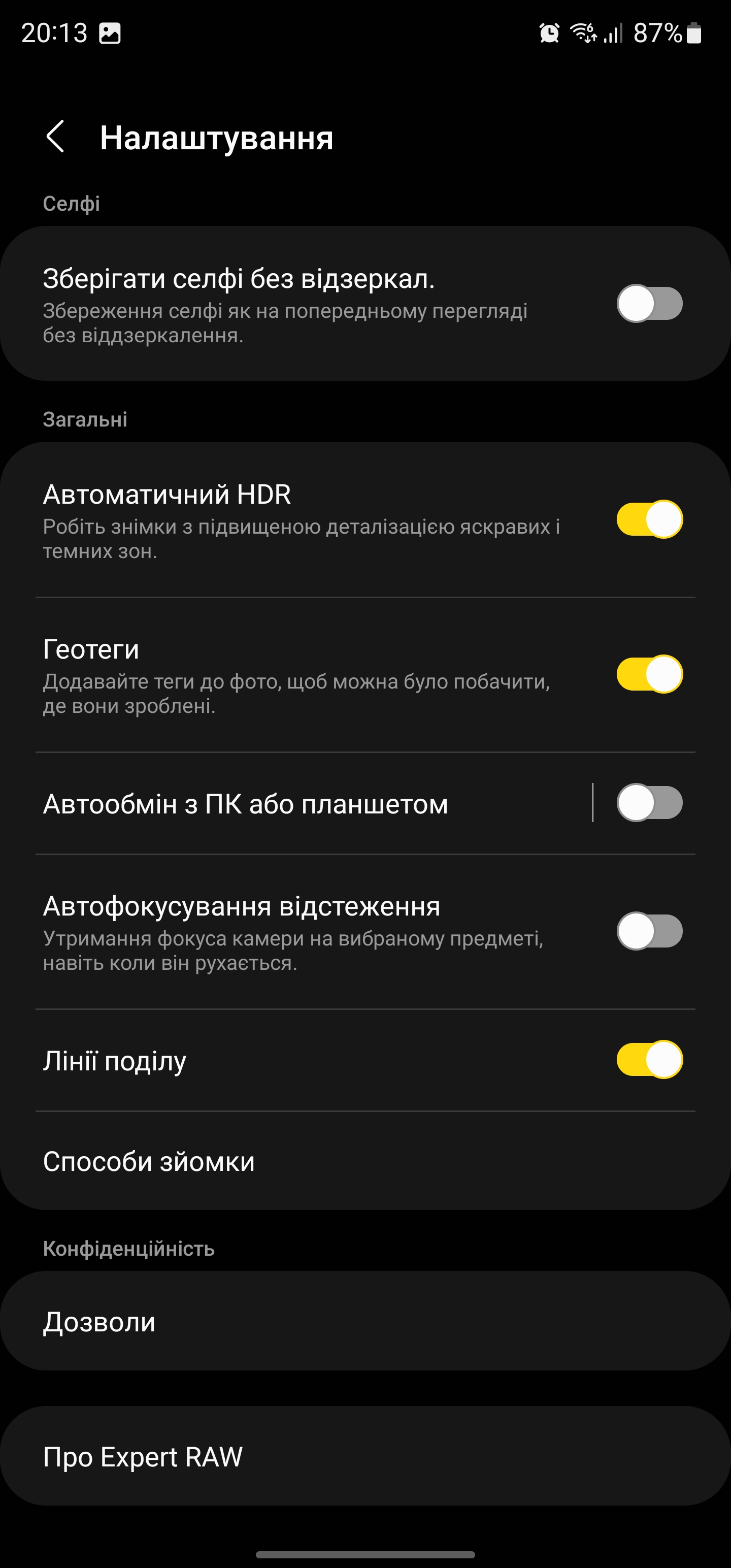 Tryb Expert RAW znajduje się teraz w zakładce Więcej, choć nadal jest to osobna aplikacja. Pozwala on na przechwytywanie nieskompresowanych obrazów RAW do ręcznej obróbki o rozdzielczości do 50 MB. Można zapisać do RAW, JPEG, ręcznych ustawień aparatu oraz dodatkowych trybów, takich jak Astrofoto (z wyborem czasu otwarcia migawki i przewodnikiem po niebie) i Multiple Exposure. Do tych trybów potrzebny będzie statyw.