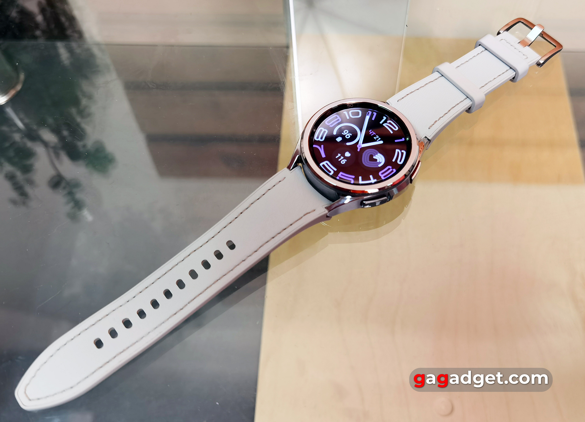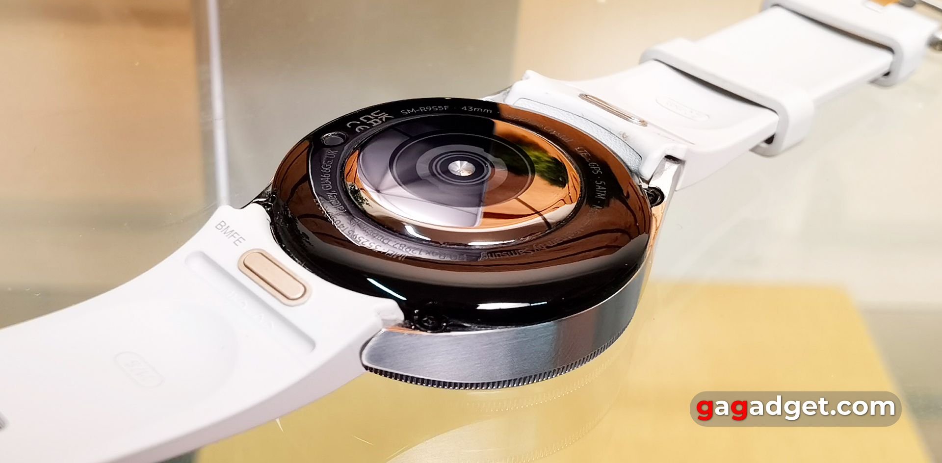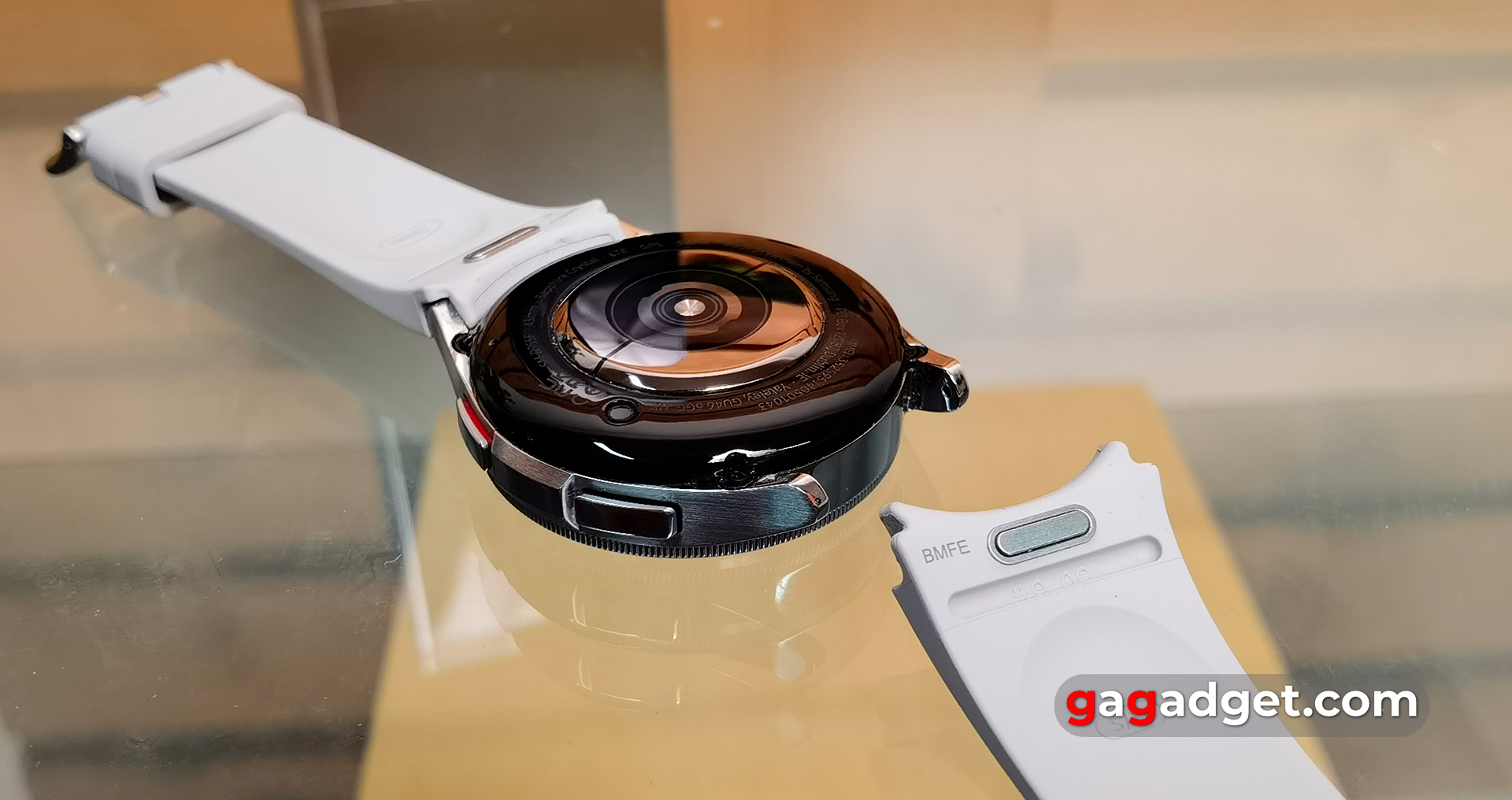 Obrotowa ramka ma małe zęby ułatwiające obracanie, a wewnątrz znajduje się czarna ozdobna ramka z oznaczeniami. Wyświetlacz jest lekko zagłębiony względem niej. Dzięki temu wyświetlacz ma dodatkową ochronę przed przypadkowymi uderzeniami. Sam wyświetlacz przykryty jest szafirowym szkiełkiem. Niemal wszystkie elementy funkcjonalne zegarka pozostały w tych samych miejscach co w poprzednich modelach. Po prawej stronie zegarka znajdują się dwa duże prostokątne przyciski mechaniczne, które są łatwe do naciśnięcia. Oprócz interakcji z systemem, przyciski służą również jako elektrody EKG i miernik bioimpedancji do analizy składu ciała użytkownika. Mikrofon do połączeń i poleceń głosowych w tym modelu nie znajduje się między przyciskami, jak poprzednio, ale nieco niżej, na dolnej pokrywie.