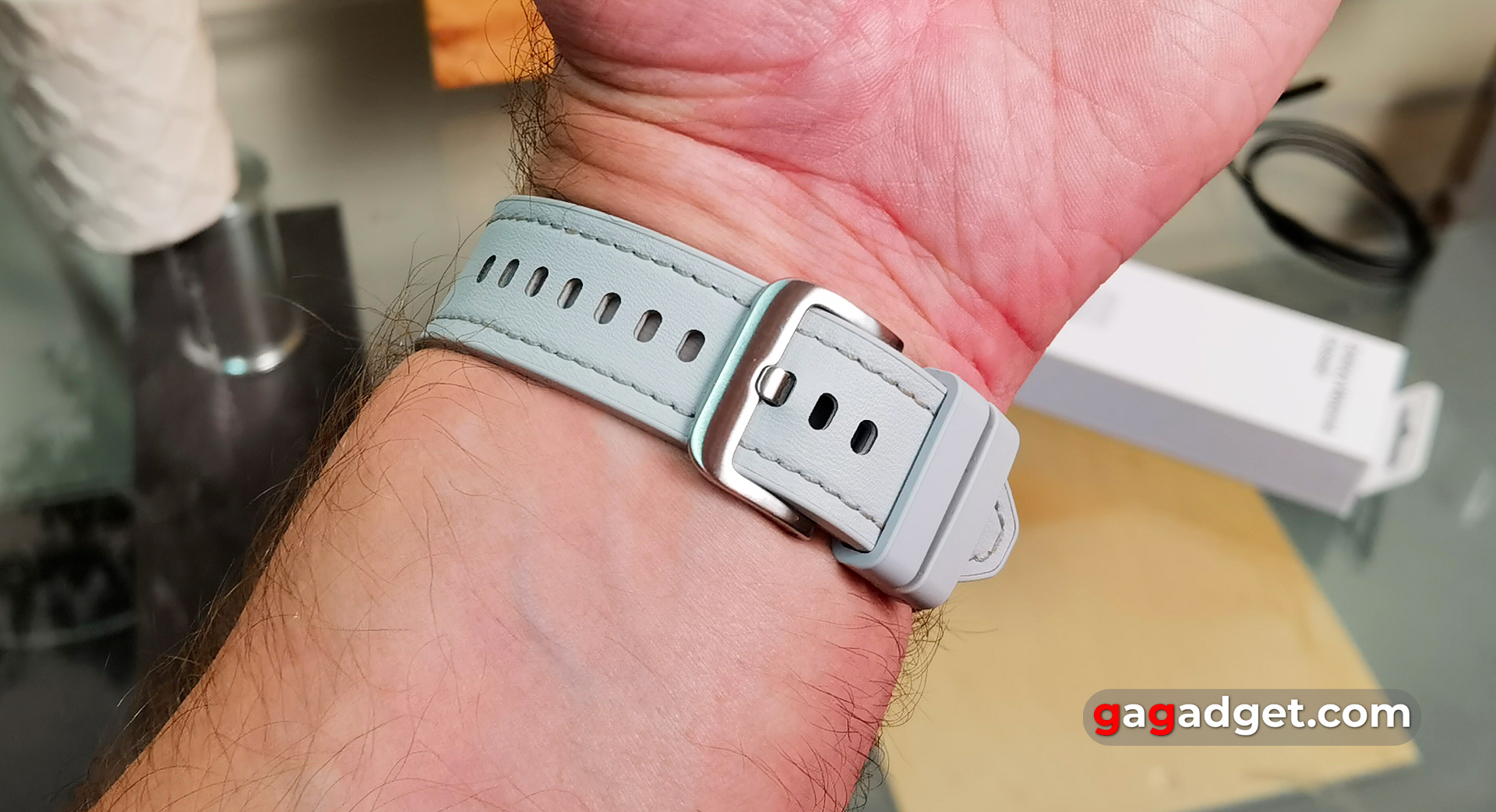 Dołączony pasek ma standardowe zapięcie i jest wykonany z dwóch materiałów. Zewnętrzny wykonany jest z ekoskóry, a wewnętrzny z silikonu. Jest całkiem wygodny i przyjemny w dotyku.