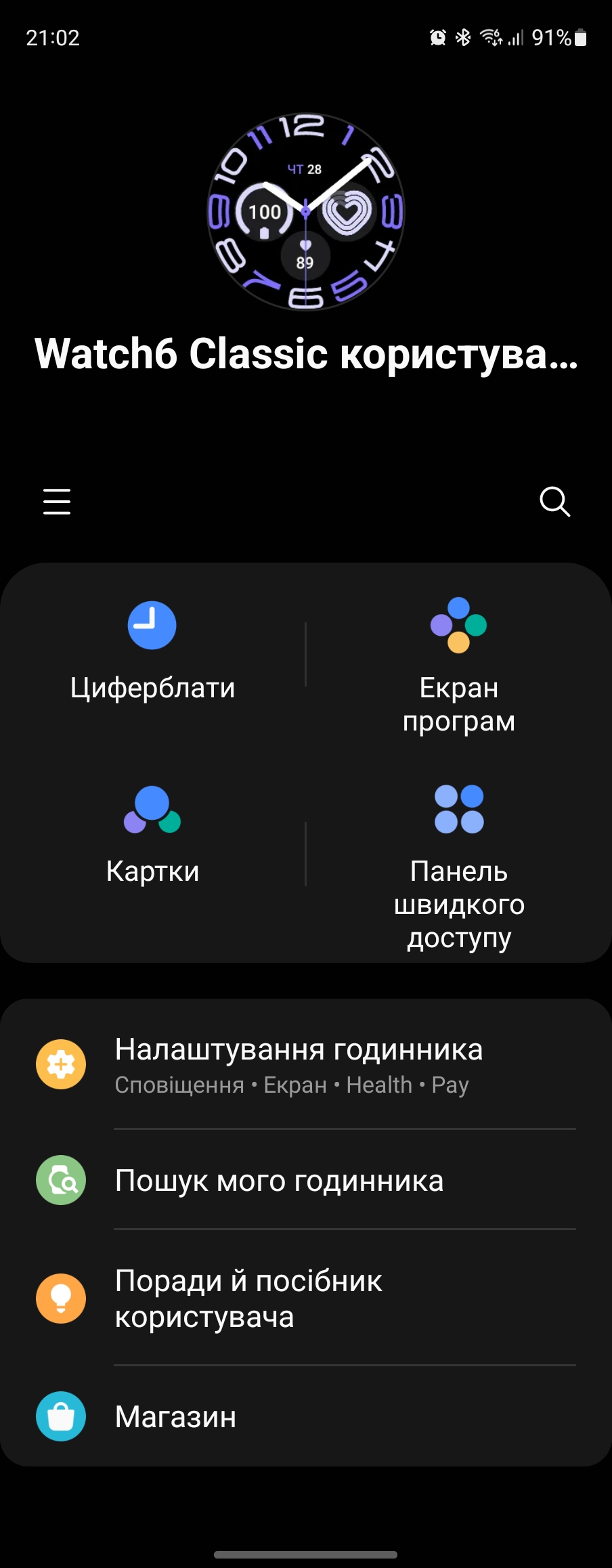 Aby w pełni współpracować z Samsung Galaxy Watch6 Classic, będziesz musiał użyć aż trzech aplikacji. Galaxy Wearable to ogólna aplikacja dla zegarków, słuchawek i innych akcesoriów firmy. Zawiera wszystkie podstawowe ustawienia: tarcze zegarka, widżety, aplikacje, powiadomienia, aktualizacje: