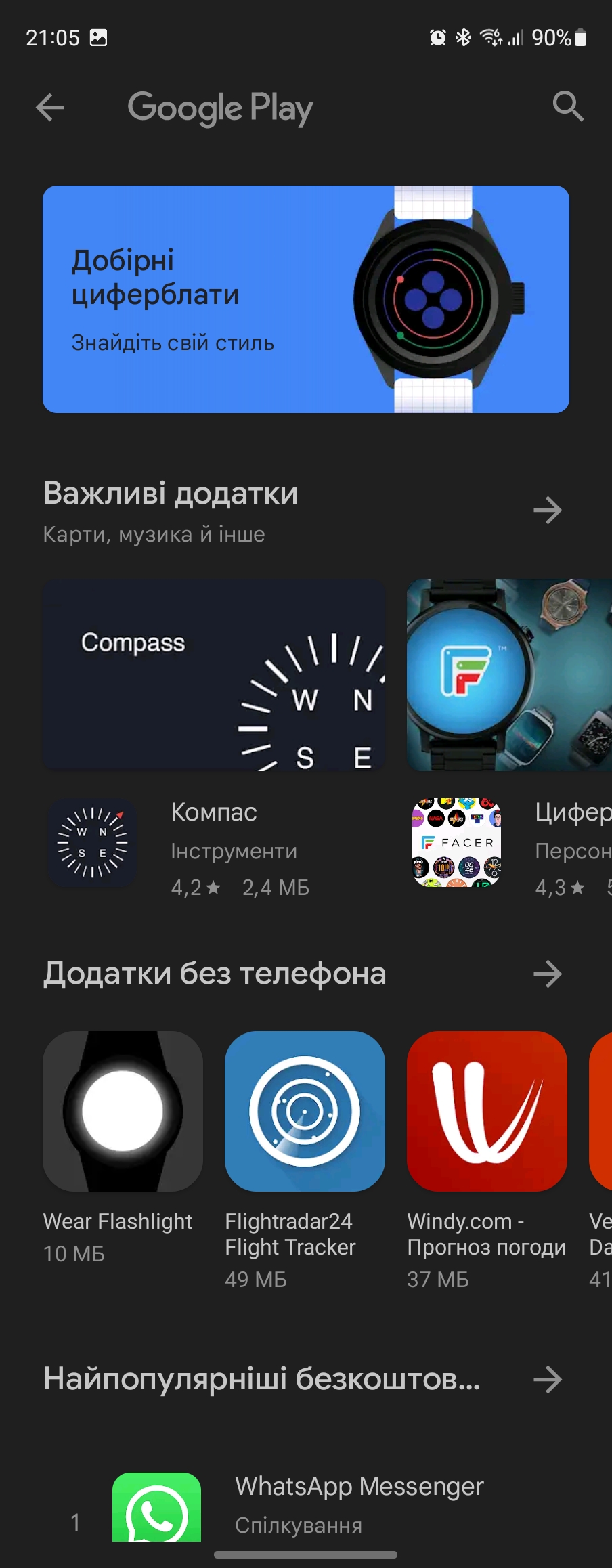 Lista wszystkich zainstalowanych aplikacji jest również wyświetlana podobnie do smartfonów: przesuwając palcem od dołu ekranu. Aplikacje prezentowane są w formie okrągłych ikon, których kolejność można zmieniać. Istnieje menedżer uruchomionych aplikacji, w którym można wyłączyć wszystkie niepotrzebne. Pobieranie i aktualizowanie odbywa się za pośrednictwem Google Play, tak jak kiedyś. Jest to modne z zegarka, jest to możliwe ze smartfona. Nie ma zbyt wielu dostępnych aplikacji. Głównie sportowe. Preinstalowane są Google Pay, Google Maps, powiadomienia, kompas, zdalne sterowanie kamerą, minutnik, natywne aplikacje dla serwisów muzycznych Spotify, Deezer, YouTube Music, Strava, Google Keep, Shazam itp.