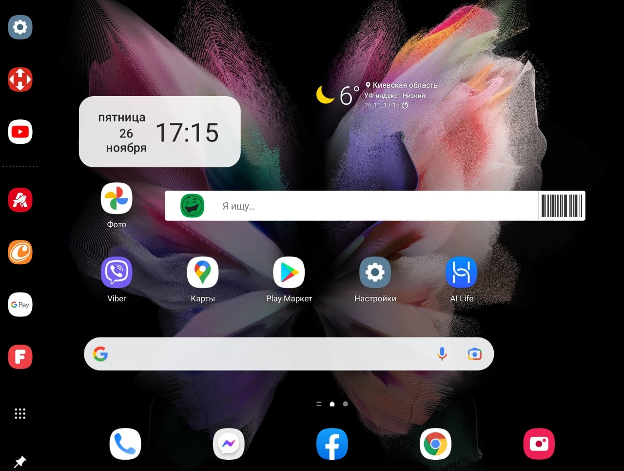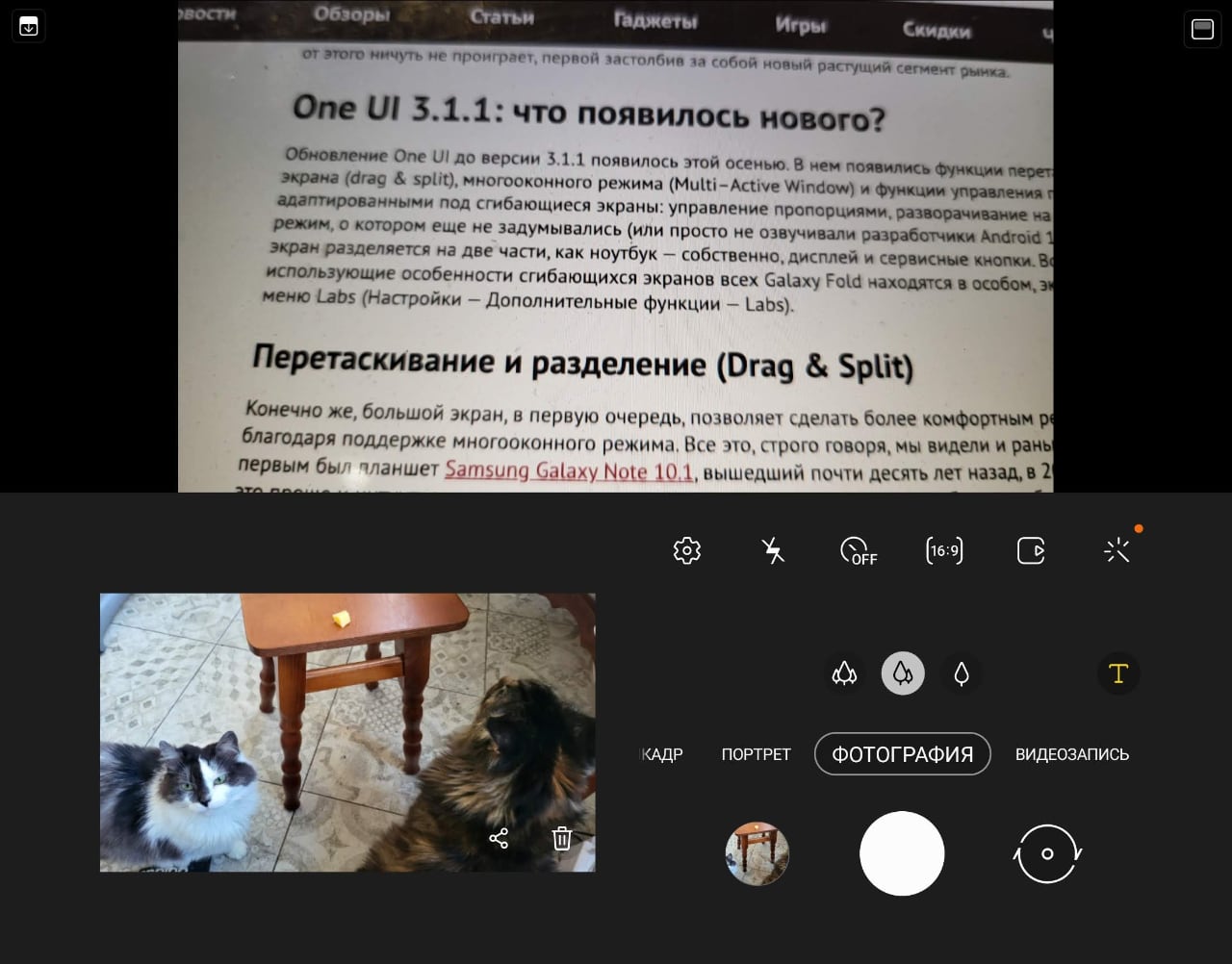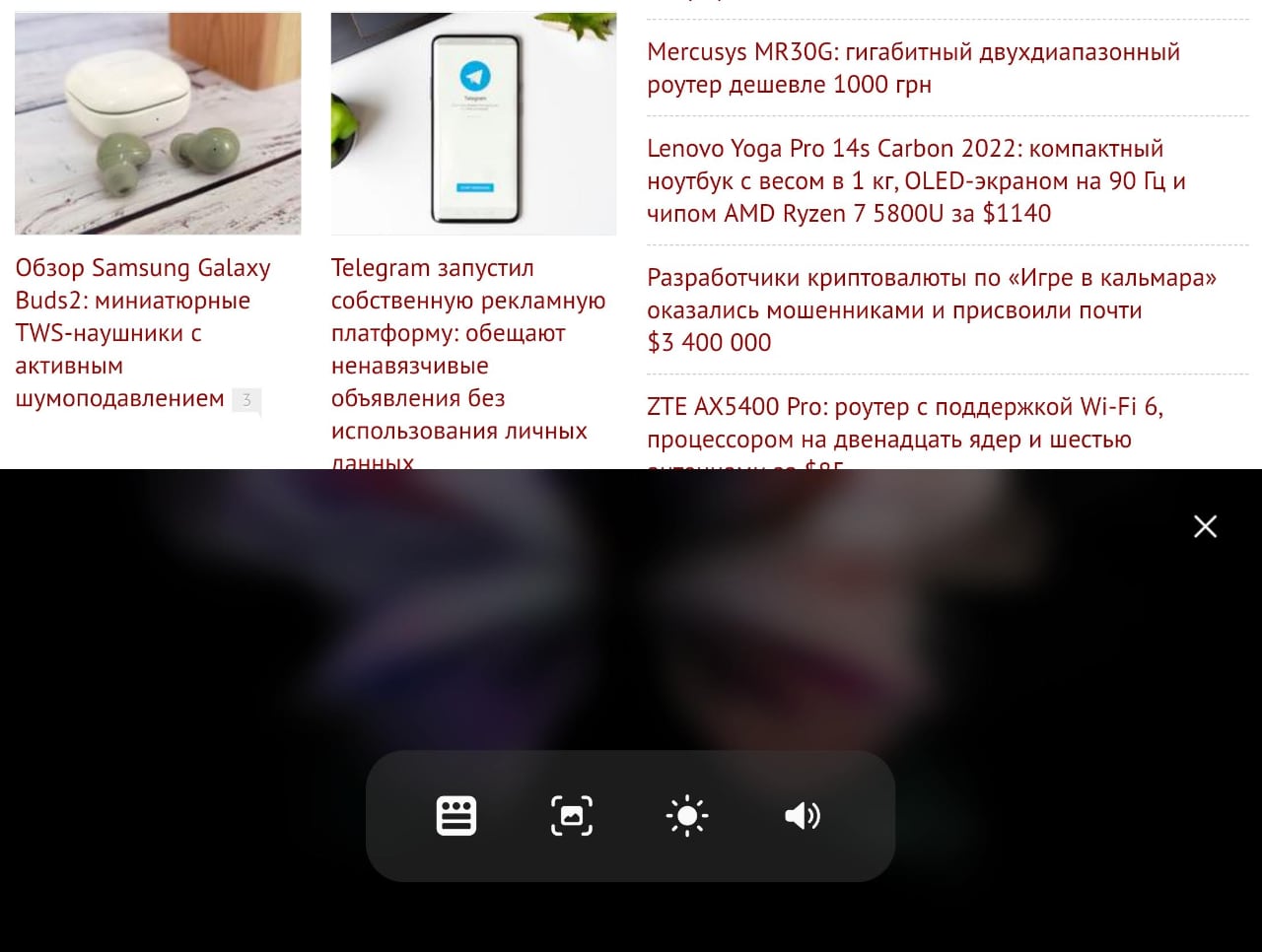 Najciekawszą, moim zdaniem, innowacją Samsunga (do której deweloperzy Google jeszcze nie dotarli) jest panel Flex oraz specjalny Flex Mode, o którym pisałem szczegółowo w Samsung Galaxy Z Fold2. W One UI 3.1.1 programiści Samsunga poszli jeszcze dalej i zaoferowali ten tryb (aktywowany również dla każdej aplikacji w menu Labs) dla dowolnej aplikacji. na zrzutach ekranu poniżej widać, jak to wygląda, ale zrzuty ekranu są oczywiście płaskie. Wyobraź sobie, że dół i góra są obrócone względem siebie o 90 stopni (lub pod dowolnym innym kątem od 75 do 115). Podczas gdy Samsung oferuje użytkownikom 4 przyciski w tym trybie: wywoływanie menu powiadomień smartfona (tego potocznie nazywanego „migawką”), robienie zrzutu ekranu, zmianę jasności i głośności. Jestem pewien, że w przyszłości będzie miejsce dla deweloperów, aby się odwrócić, oczywiście nie zatrzymają się na tych możliwościach, to dopiero pierwszy krok. A teraz wszystko wygląda dokładnie jak eksperyment – ​​przypadki użycia (i elementy interfejsu) jeszcze nie zostały wymyślone.