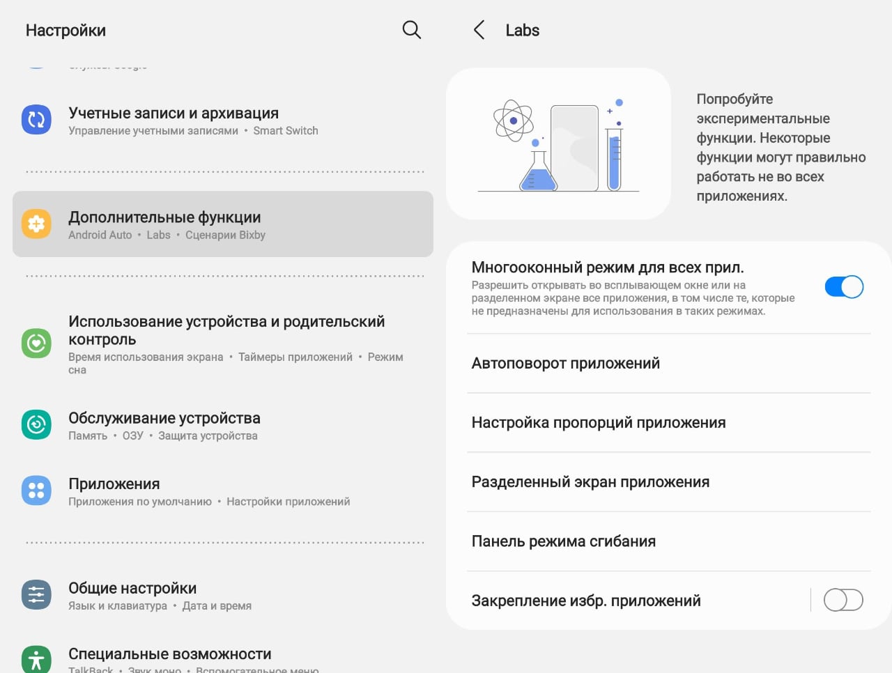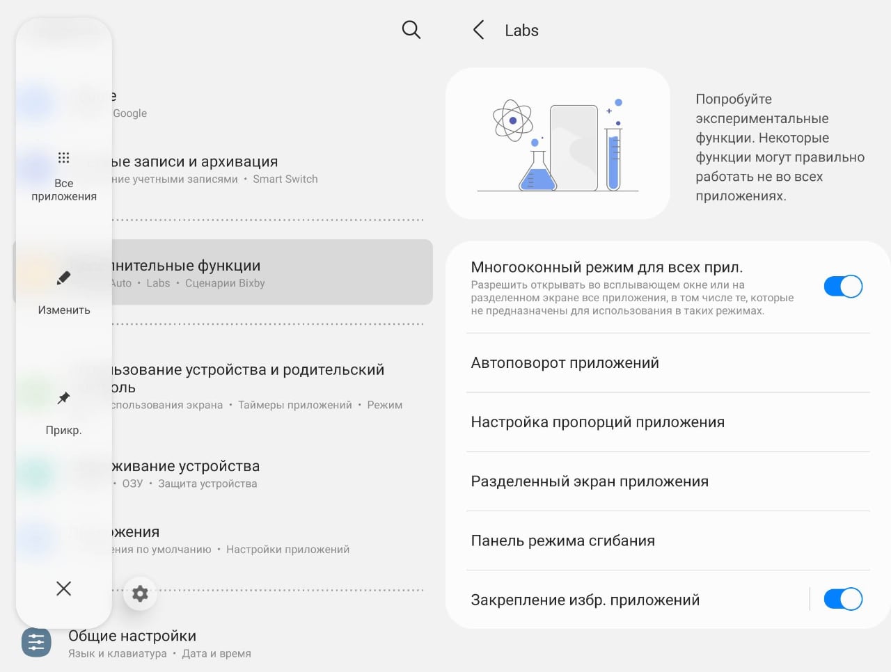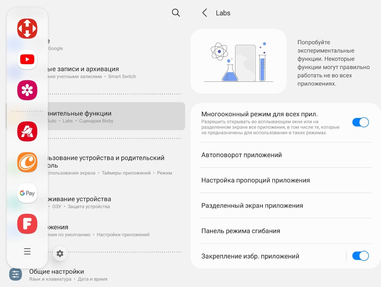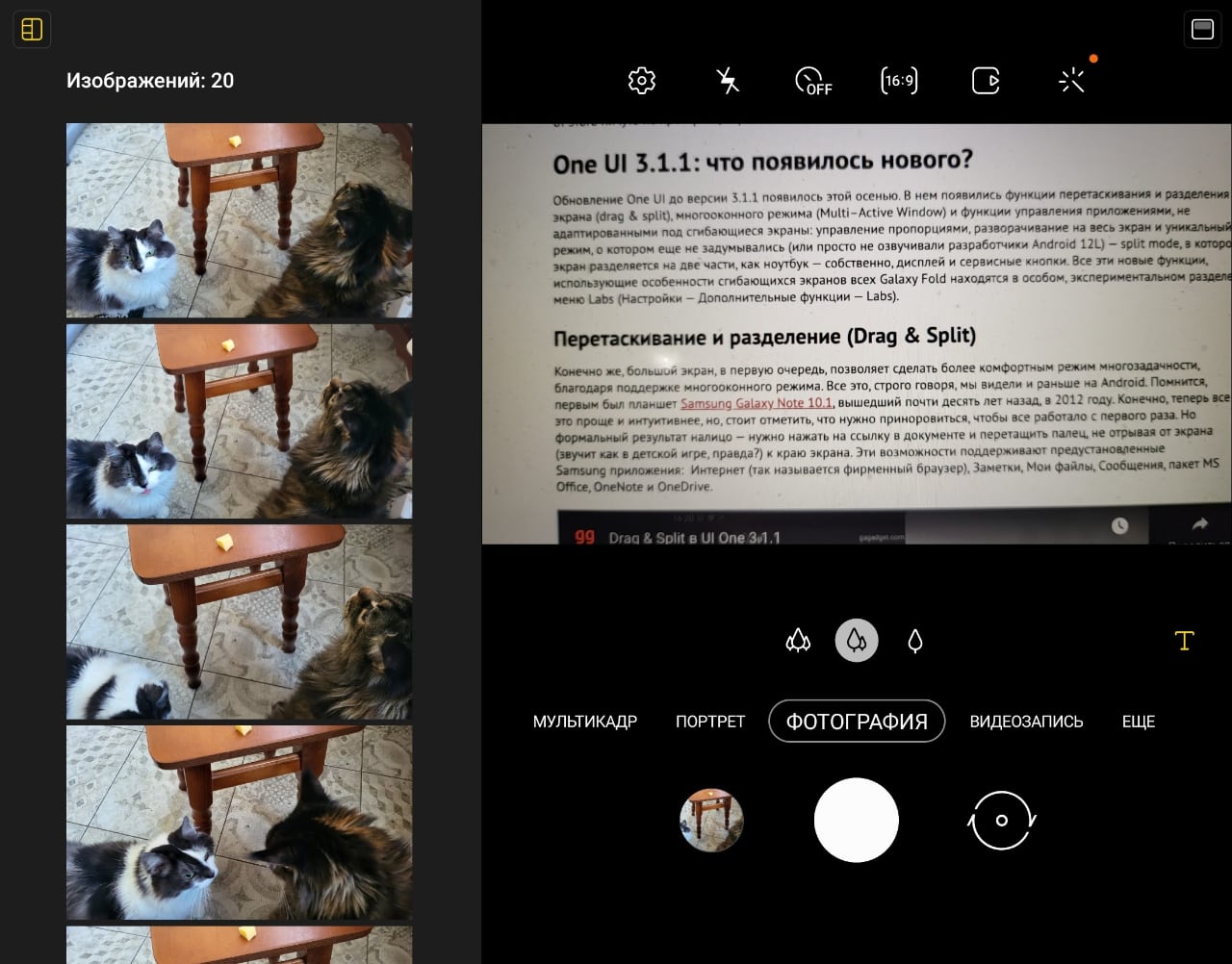 Jedna aktualizacja interfejsu użytkownika do wersji 3.1.1 pojawiła się jesienią tego roku. Wprowadza funkcje przeciągania i dzielenia, Multi-Active Window i funkcje kontrolne dla aplikacji, które nie są przystosowane do zginanych ekranów: kontrola proporcji, maksymalizacja pełnego ekranu i unikalny tryb, o którym jeszcze nie pomyślano (lub po prostu nie wyrażony przez programistów). Androida 12L) – tryb dzielony, w którym ekran jest podzielony na dwie części, jak laptop – tak naprawdę wyświetlacz i przyciski serwisowe. Wszystkie te nowe funkcje, które wykorzystują składane funkcje ekranu wszystkich Galaxy Folds, można znaleźć w dedykowanej, eksperymentalnej sekcji menu Labs (Ustawienia - Funkcje zaawansowane - Laboratoria).