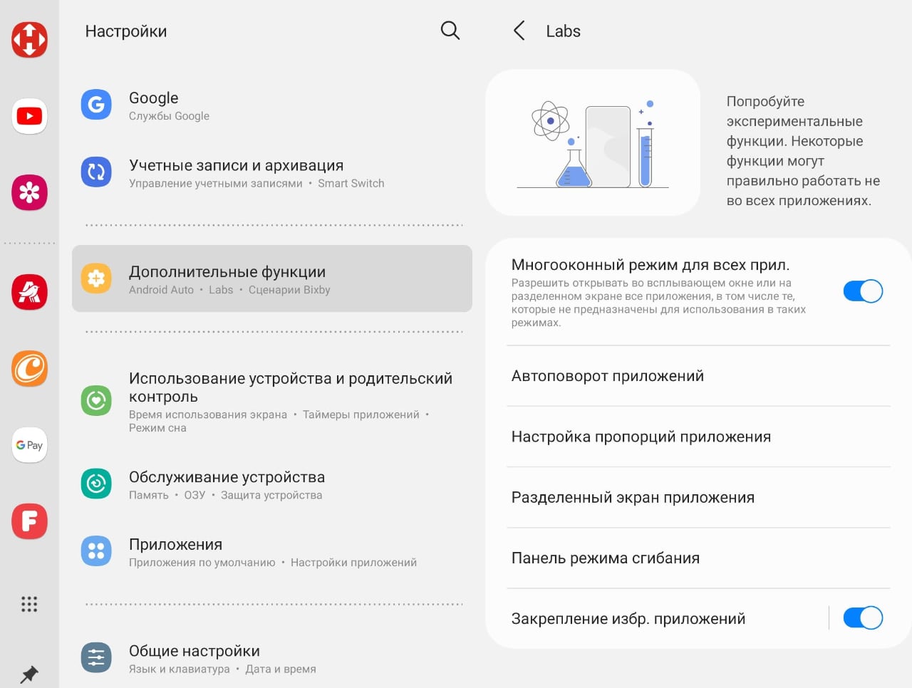 Tutaj możesz dostosować proporcje ekranu zewnętrznego (zrzuty ekranu były powyżej) i panelu trybu gięcia (Flex). Pozycja „Podzielony ekran aplikacji” zawierała tylko jedną WhatsApp, gdzie można było na siłę włączyć wygodne wyświetlanie w dwóch kolumnach, więc nie skupiałem się na tym w opisie nowych funkcji wersji 3.1.1. Wreszcie przełącznik „Ulub. Aplikacje ”służy do aktywacji paska zadań opisanego powyżej. Jeśli ten element jest wyłączony, nie można go przypiąć do ekranu, a użytkownikowi pozostaje tylko zwykły panel Edge.