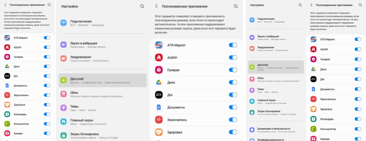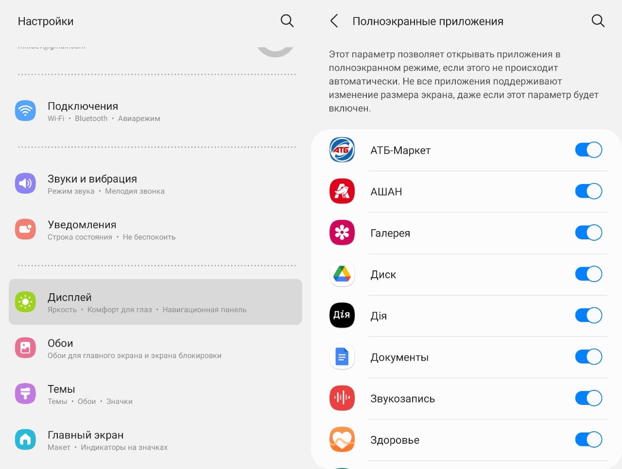 W ustawieniach wyświetlania znajduje się osobna pozycja menu „Aplikacje pełnoekranowe”, w której można na siłę określić, które aplikacje mają być otwierane na pełnym ekranie, nawet jeśli nie mają wersji na duże i składane ekrany. Brakuje mi tylko oczywistego przycisku „zaznacz wszystko”, wierzę, że zostanie dodany. Można też zasugerować, że takie menu będzie do tych samych celów w Androidzie 12L (tu wracamy do tematu naszej opowieści).