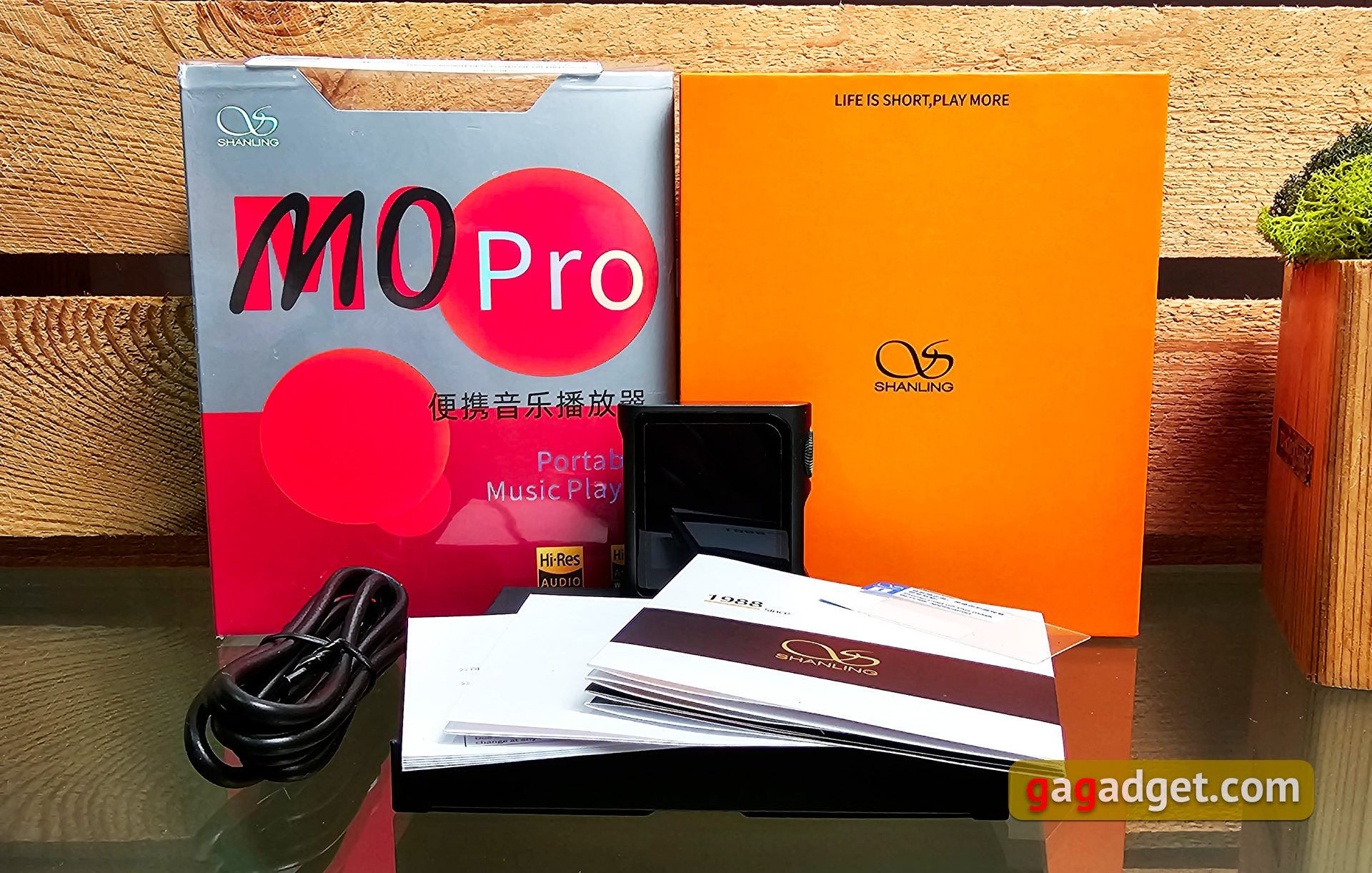 Shanling M0 Pro jest dostarczany w stosunkowo małym pomarańczowym pudełku z jasną pokrywą, która zawiera podstawowe informacje techniczne, w tym oznaczenia Hi-Res Audio, Audio Wireless. W zestawie znajdują się tylko najpotrzebniejsze rzeczy. Oprócz samego odtwarzacza znajdziemy tam kabel Type-C, dokumentację oraz zapasową folię ochronną na ekran (jedna jest przyklejona fabrycznie).