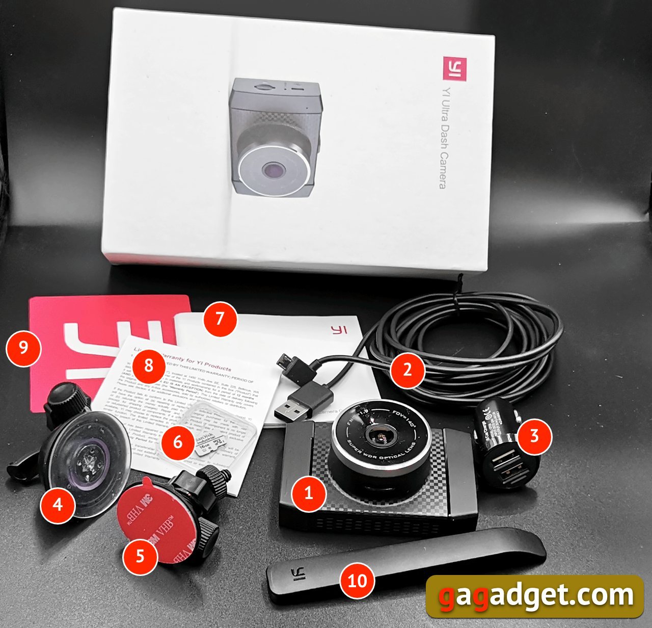 Wcześniej używałem entry-level DVR Yi Smart Dash, co kosztuje około 40 $ i całkiem mi się podobał. Wyróżnia się wsparciem dla ADAS (zaawansowanych systemów wspomagania kierowcy) - asystenta głosowego, który prawie natychmiast wyłączyłem, ponieważ nie działa poprawnie na naszych drogach. Są zbyt nierówne dla delikatnej elektroniki, więc nieustannie wierzył, że nie zachowałem dystansu i przekroczyłem oznaczenia paska. W rezultacie miałem dość słuchania co 3 minuty na torze „zachowaj dystans” na nim i wyłączyłem go. Model Ultra Dash nie ma systemu ADAS, a także ma nieco mniejszy kąt widzenia - 140,6 ° w porównaniu do 165 °. Ale bogatsza klasa, którą ktoś mógłby uznać za wartą dodatkowych 15 dolarów. Tak więc w pudełku z Yi Ultra Dash znajdują się: