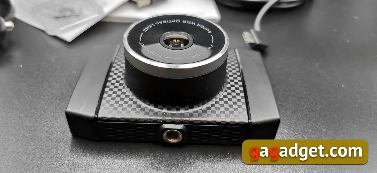 Zewnętrznie YI Ultra Dash wygląda jak każdy inny rejestrator, ale ma przyjemny moment w postaci metalowego pierścienia statywu, co natychmiast mnie ucieszyło - poprzedni rejestrator miał własny uchwyt, który nie był zbyt wygodny w użyciu, który był dość postrzępiony przez 3 lata życia (Ja zdejmuję rejestrator DVR, jeśli parkuję w dzikiich miejscach, jednak w Kijowie nie ma ich wiele). Tam jest zwykły gwint, możesz go łatwo przykręcić do statywu, nawet nie patrząc. Na przednim panelu rejestratora znajduje się dekoracyjna wkładka „pod karbon”. Na dolnym i górnym końcu znajdują się otwory wentylacyjne, głośnik umieszczono pod wystającą częścią soczewki. Mikrofon znajduje się na tylnym panelu, w lewej dolnej części, pod parą diod LED. Górna czerwona dioda LED jest używana podczas ładowania, dolna, pomarańczowa, wskazuje, że aparat nagrywa (miga raz na sekundę). Ogólnie rzecz biorąc, nagranie jest już widoczne, ale raptem, w przeciwieństwie do mnie, chcesz wyłączyć wyświetlacz podczas nagrywania.