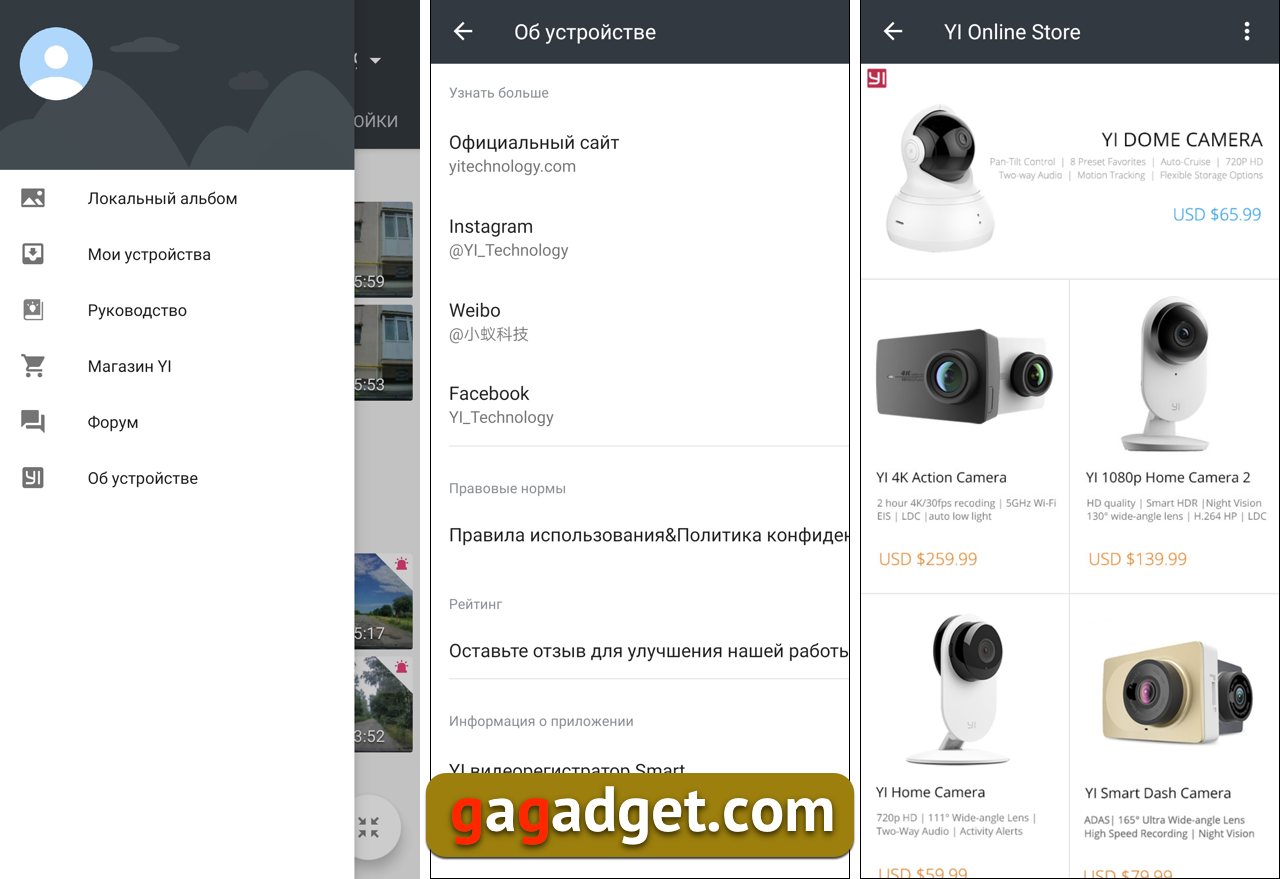 Kliknięcie na „hamburger” ujawnia inne pozycje menu, ale nie ma nic szczególnie interesującego - skromne szczegóły na temat modelu i producenta, i linki na stronę YI i konta na portalach społecznościowych (nawiasem mówiąc, mają Instagram w języku rosyjskim ).