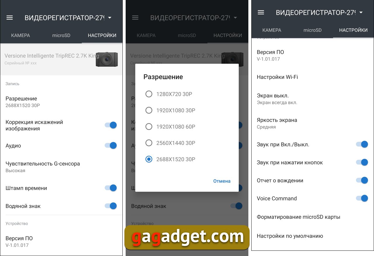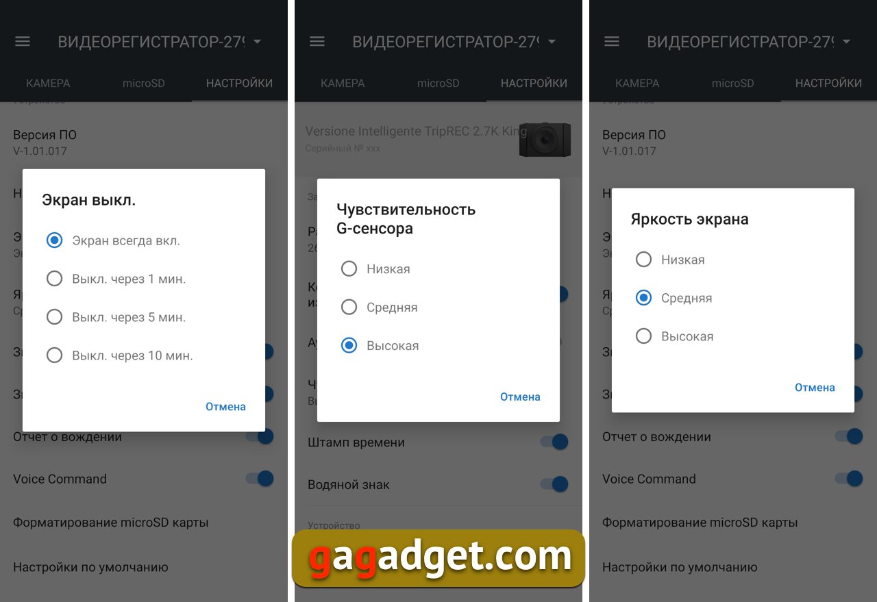 W ustawieniach możesz kontrolować rozdzielczość wideo (maksymalnie 2688 x 1520, ale rejestrator ma procesor Hi3556 V100, który obsługuje rozdzielczości do 1440P przy 30 fps, więc wydaje się, że jest to interpolacja), czułość czujnika, który aktywuje chronione nagrywanie. Możesz dostosować jasność ekranu lub wyłączyć go. Do nagrania można dodać znak wodny YI i znaczniki czasu. Istnieje funkcja „raport z jazdy” i „sterowanie głosowe”, ale cały raport sprowadza się do statystyk reakcji czujników po podróży (jeśli było to dłużej niż 10 minut), a kontrola głosowa umożliwia zrobienie zdjęcia lub przesłanie bieżącego wideo do chronionego obszaru głosem, bez użycia rąk , co oczywiście jest wygodne podczas jazdy, ale są niuanse. Nawiasem mówiąc, polecenie głosowe jest zazwyczaj jedynym sposobem na zrobienie zdjęcia, nie ma na to przycisków. Przeciwnie, wideo można zapisać, klikając czerwony przycisk na rejestratorze.