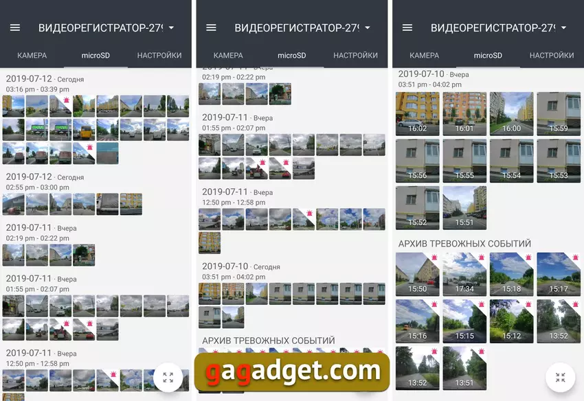 Na karcie pamięci znajdują się trzy foldery: Film, Zdjęcie i EMR (przenoszą się tam filmy oznaczone jako „alarm”). Aplikacja ma trzy zakładki - kamera (tryb transmisji na żywo), microSD (zawartość karty pamięci z dwiema opcjami prezentacji - w postaci dużych i mniejszych ikon). I zakładka ustawień.