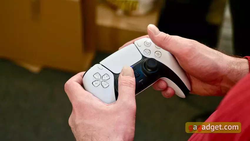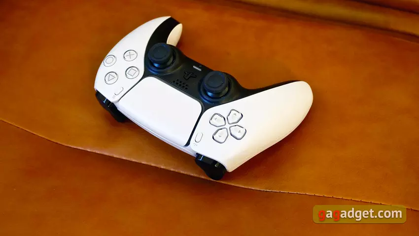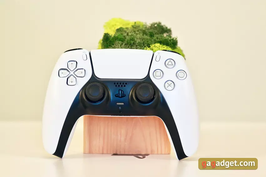 Mówiąc o głównych przyciskach. Są teraz wykonane z przezroczystego plastiku, a oznaczenia znajdują się wewnątrz. Jednocześnie koło, kwadrat, trójkąt i krzyż nie są już wielokolorowe, ale mają jeden szary kolor. Jak również zapis na D-Padzie. Przyciski D-Pad, według osobistych odczuć, są nieco mocniejsze niż w DualShock 4, ale jest to wygodne w użyciu, nie było problemów. Drążki analogowe zachowały swój wygląd, ale ramki na obwodzie stały się bardziej teksturowane i ostre, co moim zdaniem jest plusem.