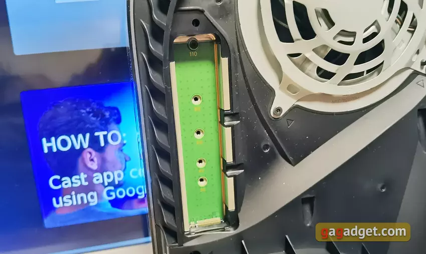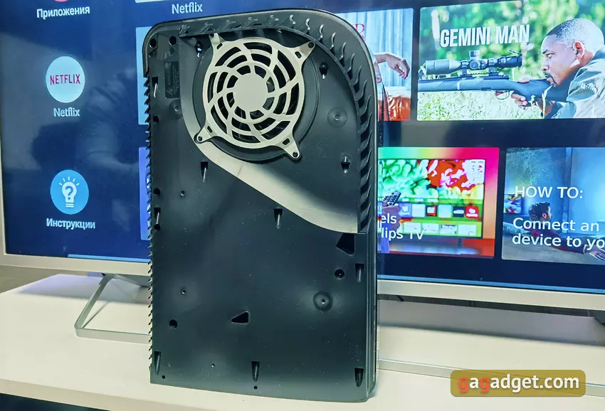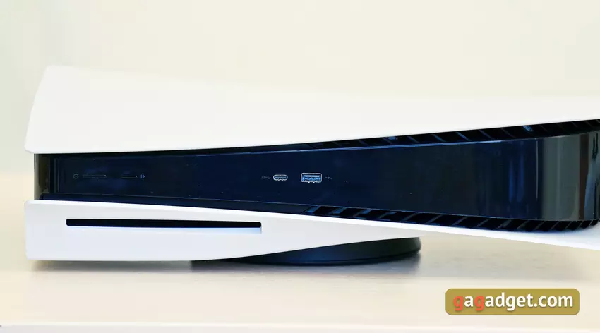 Z drugiej strony historia jest nieco ciekawsza. Napęd optyczny jest widoczny, a tuż nad nim znajduje się kolejna metalowa osłona. To jest złącze SSD M.2. Fizycznie możliwe jest zainstalowanie dowolnego standardowego rozmiaru. Ale jak dotąd ten slot nie jest używany: PS5 nie obsługuje jeszcze rozszerzenia pamięci. Oczywiście pojawi się w przyszłości, ale nie ma jeszcze harmonogramu.