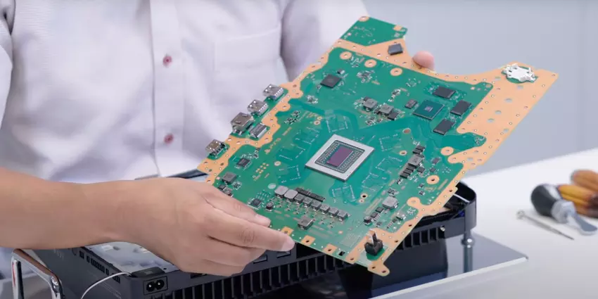 Sony umieściło wszystkie komponenty sprzętowe konsoli na jednej płycie, w tym procesor, układ graficzny, moduły RAM, SSD i tak dalej. Do chłodzenia służy ogromny aluminiowy radiator z miedzianą podstawą i rurkami przewodzącymi ciepło, których wydajność porównywalna jest z komorą parową (według Sony). Za aktywne chłodzenie odpowiada chłodnica o średnicy 120 mm i grubości 45 mm. Aby wciągnąć zimne powietrze, między konsolą środkową a panelami bocznymi zastosowano otwory. Jednak najbardziej niezwykłym rozwiązaniem w układzie chłodzenia jest zastosowanie ciekłego metalu jako interfejsu termicznego do chłodzenia procesora. Wcześniej był używany głównie w niestandardowych zespołach, w masowej produkcji – tylko w topowych laptopach gamingowych ASUS. Jak wyjaśnił Yasuhiro Otori, szef działu technicznego PlayStation 5, płynny metal jest bardzo skutecznym interfejsem i pozwolił na pewne oszczędności we wszystkich innych elementach systemu chłodzenia.