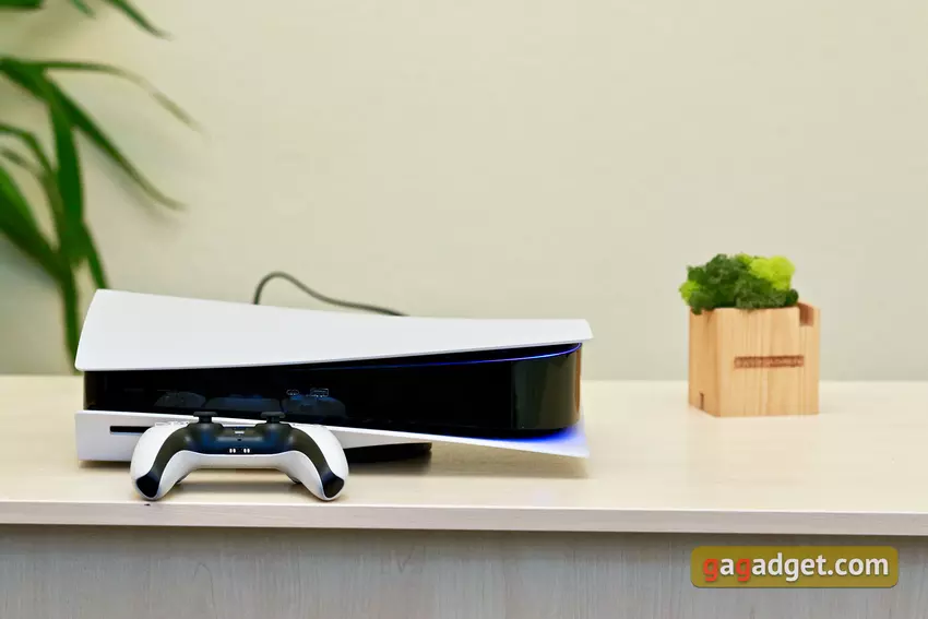 Z praktycznego punktu widzenia nowa forma ma swoje niuanse. Dotyczy to również podstawki i kilku dodatkowych punktów. Pierwszy to wymiary, co jest oczywiste: 39x26x10,4 cm, dzięki temu wszystko jest bardzo indywidualne, zależy wyłącznie od dostępnej przestrzeni obok telewizora lub w szafce pod nim. W większości przypadków konsolę PlayStation 5 można umieścić tylko pionowo z boku telewizora. W poziomie te same problemy nie muszą występować: półki w szafkach RTV, zarówno na szerokość, jak i na wysokość, w większości zmieszczą się z zapasem.