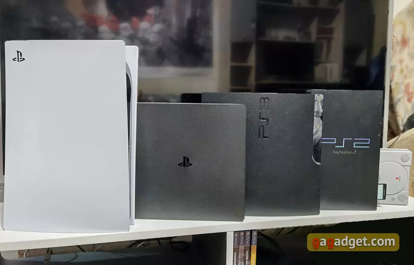 I tak wygląda PlayStation 5 w towarzystwie swoich krewnych: Sony PlayStation 4 Slim, PlayStation 3 Slim, PlayStation 2 i PlayStation Classic. Możesz wyraźniej ocenić wymiary.