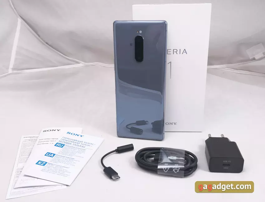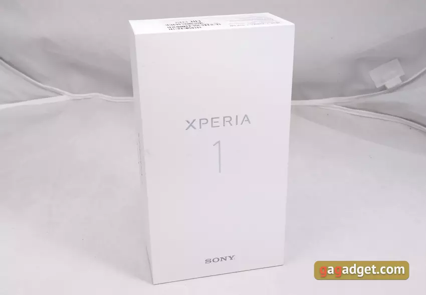 Pudełko jest wykonane z białego kartonu, z zewnątrz - tylko nazwa modelu i niezbędne informacje techniczne. Bez kolorowego drukowania. Mamy smartfon z niezupełnie kompletnym zestawem. W pudełkach komercyjnych, oprócz samej Sony Xperia 1, znajdzie się ładowarka USB-PD 18-watowa, kabel Type-C, adapter od Type-C do 3,5-milimetrowego gniazda oraz wewnętrzny zestaw słuchawkowy ze standardowym gniazdem (nie mieliśmy go w pudełku) ).