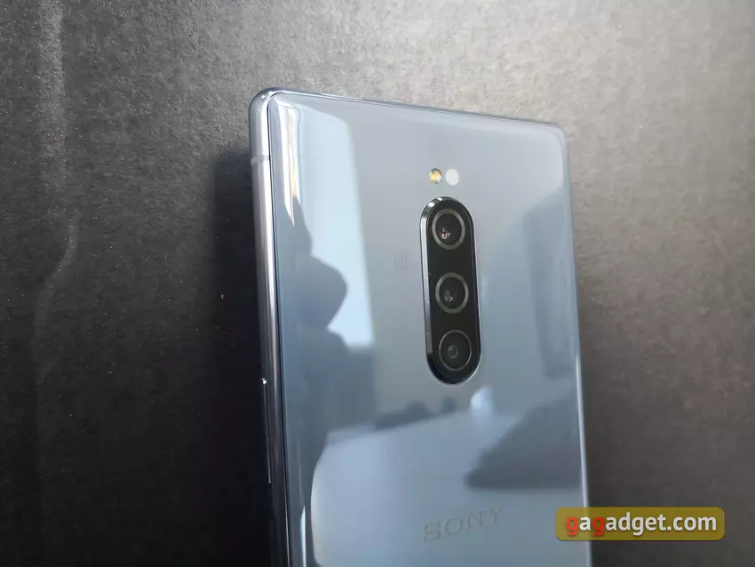 Tylny panel jest szklany, w górnej części znajduje się kamera główna, pośrodku znajduje się logo Sony. Tylna pokrywa jest zaokrąglona po bokach, co zapewnia wygodniejszy chwyt. Co ciekawe, tło na żywo wygląda o wiele atrakcyjniej niż na oficjalnych rendererach. Do nas na recenzję przyjechał „nudny” szary kolor. Na żywo troszeczkę "ucieka" w niebieski odcień i wygląda bardzo dobrze. Również sprzedawana jest czarną wersja. Mniej „nudzące” białą i fioletową, niestety, postanowiono nie dostarczać: