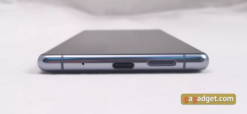 Zewnętrznie smartfon wygląda bardzo nietypowo: jest bardzo długi ze względu na proporcje. Jest o około centymetr dłuższy niż inne nowoczesne flagowe smartfony. Z drugiej strony ten współczynnik kształtu pozwalał na zmniejszenie szerokości. Dla porównania, szerokość 6,4-calowego Galaxy S10 + wynosi 74,2 mm, 6,5-calowy Sony Xperia 1 ma 72 mm. Z tego powodu używanie jednej ręki jest całkiem realistyczne, a nawet wygodne. Niektóre trudności mogą być tylko z niezbyt głębokimi kieszeniami, w których smartfon może po prostu się nie zmieścić ze względu na długość. Chociaż jest to raczej szczególny przypadek: smartfon zmieści się w standardowych męskich dżinsach bez problemów. Ramy po bokach ekranu są cienkie, podbródek jest mały, bez dodatków. Nad ekranem znajduje się głośnik, czujniki, kamera przednia i wskaźnik powiadomień: