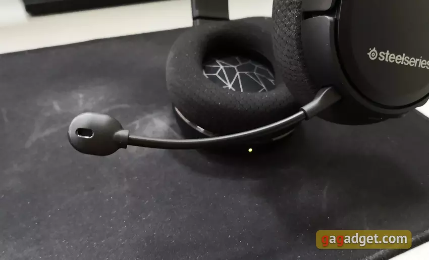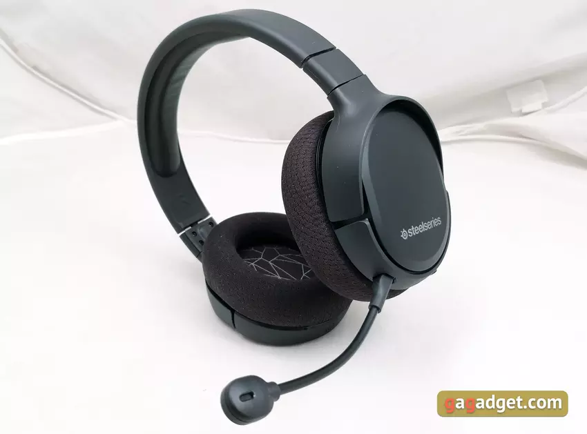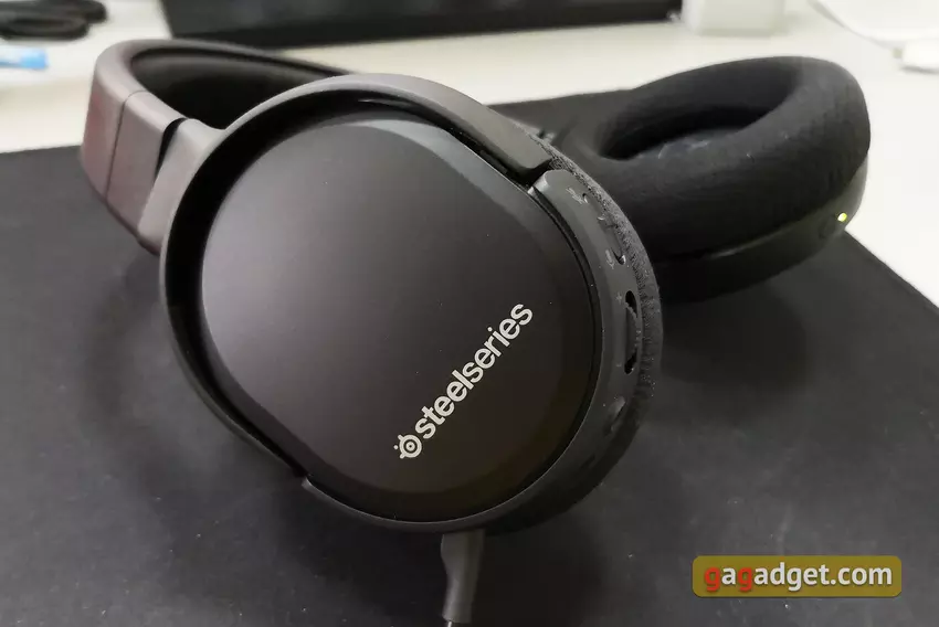 Zakres regulacji rozmiaru pałąka jest dość szeroki, a siła docisku jest optymalna. Zestaw słuchawkowy nie spada, ale i nigdzie zbytnio nie zaciska. Rozmiar miseczek i poduszek na uszy pozwala na całkowite zanurzenie małżowiny usznej. Nie powiem nic o lecie, ale teraz, w listopadzie, w SteelSeries Arctis 1 Wireless, możesz siedzieć w zestawie przez cały dzień pracy prawie nie zdejmując i nie odczuwać dyskomfortu. Uszy nie „przegrzewają się”, nic nie naciska nigdzie i nie przeszkadza. Istnieje podejrzenie, że tapicerka ze sztucznej skóry zapewni lepszą izolację akustyczną, ale tkanina jest zdecydowanie wygodniejsza. Wygoda jest również ułatwiona dzięki niskiej wadze zestawu słuchawkowego: nie moglem znaleźć informacji na oficjalnej stronie internetowej, ale w sieci piszą, że nieco więcej niż 250 g. Jest to bardzo skromne jak na standardy pełnowymiarowego bezprzewodowego zestawu słuchawkowego.
