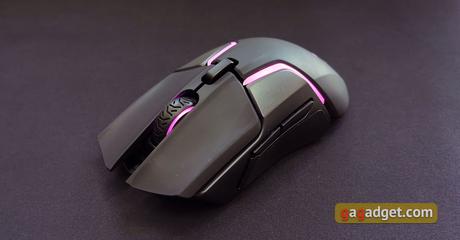Z tyłu myszy znajduje się logo SteelSeries ze światłem. Materiały są przyjemne i wysokiej jakości, ale wiadomo, że Soft-Touch szybko pokrywa się śladami użytkowania. Po prawej stronie znajduje się duża gumowana wkładka na kciuk i trzy dodatkowe przyciski. Dwie górne najlepsze są zlokalizowane i wdrożone z powodzeniem, separacja jest dobrze wyczuwalna. Trzeci - znajduje się na odległości i jest trudniejszy do osiągnięcia: