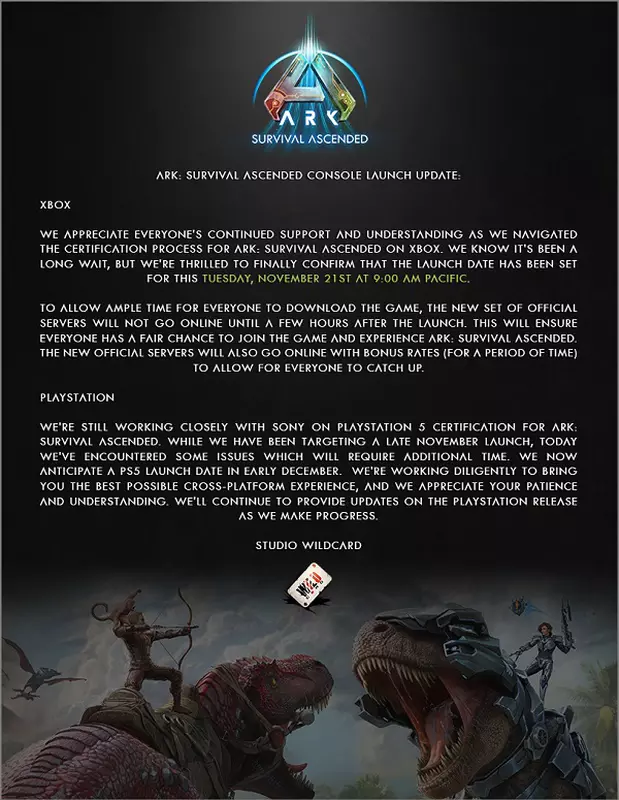 Twórcy symulatora przetrwania ARK: Survival Ascended (zaktualizowana wersja ARK: Survival Evolved) ze studia Wildcard ogłosili ważne informacje na temat konsolowych wersji gry.